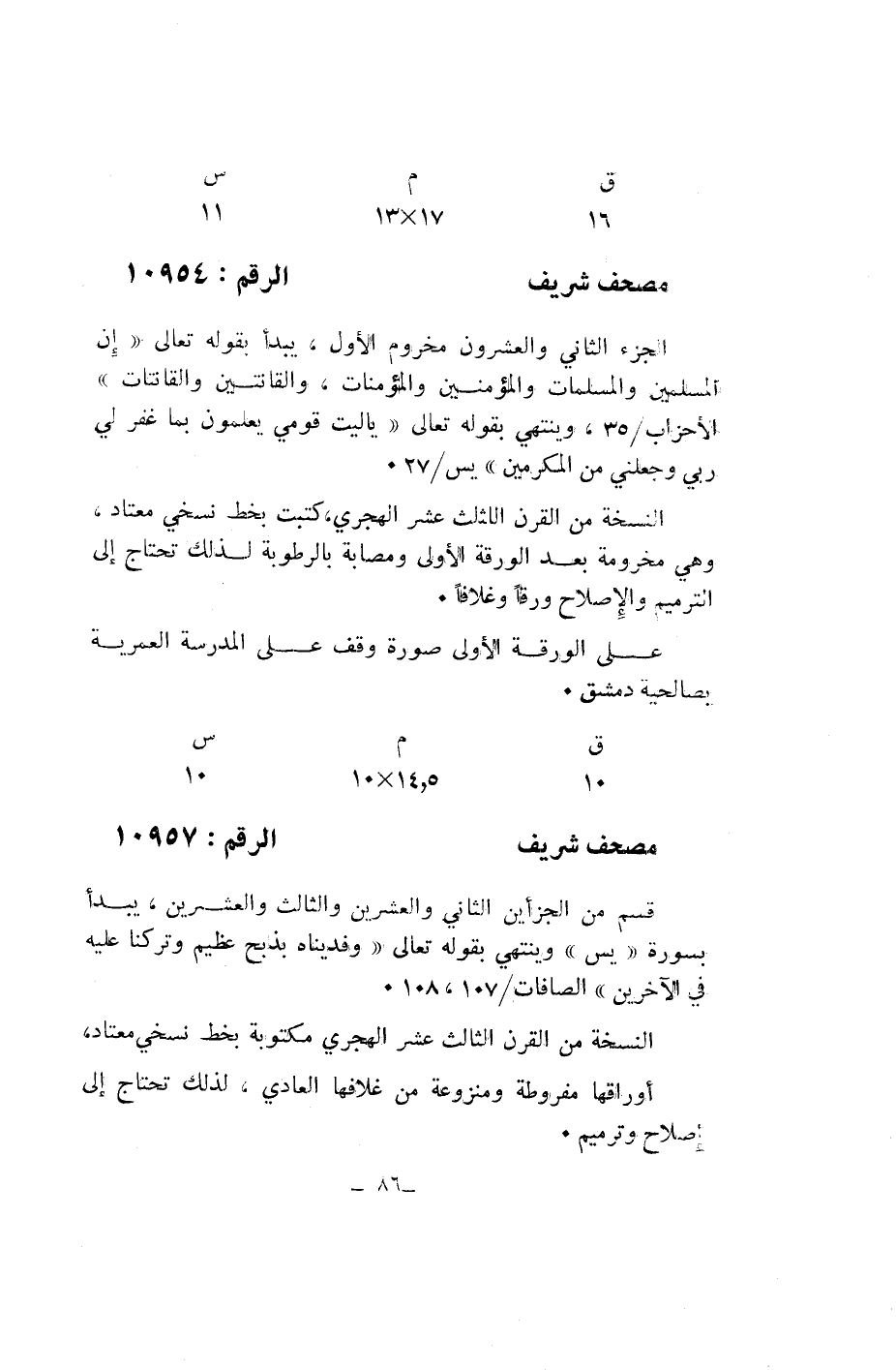 الجزء الثاني والعشرون مخروم الأول، يبدأ بقوله تعالى «إِنَّ الْمُسْلِمِينَ وَالْمُسْلِماتِ وَالْمُؤْمِنِينَ وَالْمُؤْمِناتِ، وَالْقانِتِينَ وَالْقانِتاتِ» الأحزاب/ 35، وينتهي بقوله تعالى «يا لَيْتَ قَوْمِي يَعْلَمُونَ بِما غَفَرَ لِي رَبِّي وَجَعَلَنِي مِنَ الْمُكْرَمِينَ» يس/ 27.