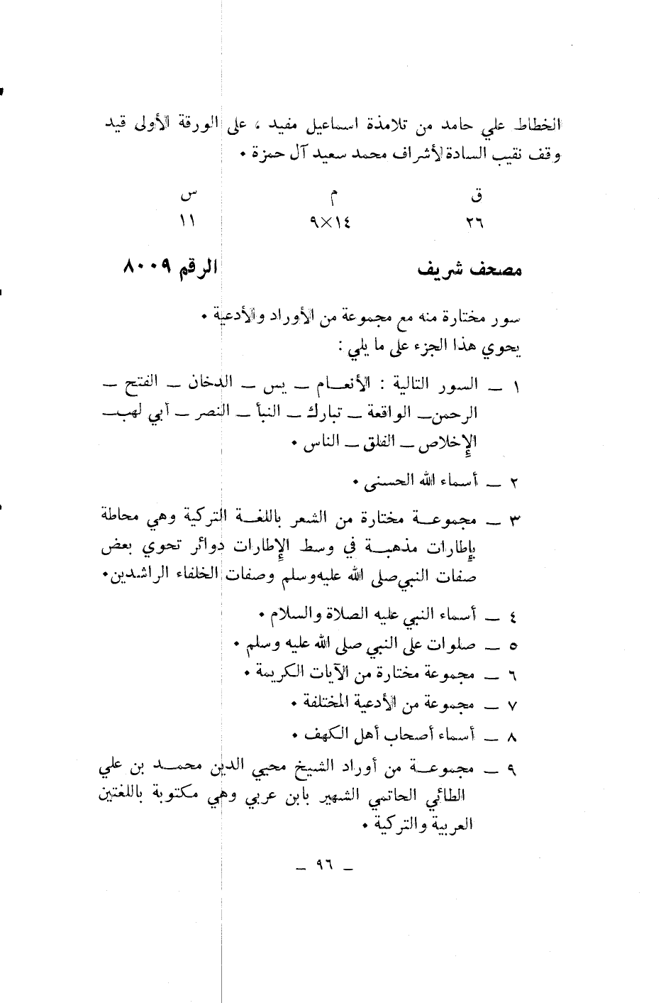 9 - مجموعة من أوراد الشيخ محيي الدين محمد بن علي الطائي الحاتمي الشهير بابن عربي وهي مكتوبة باللغتين العربية والتركية.