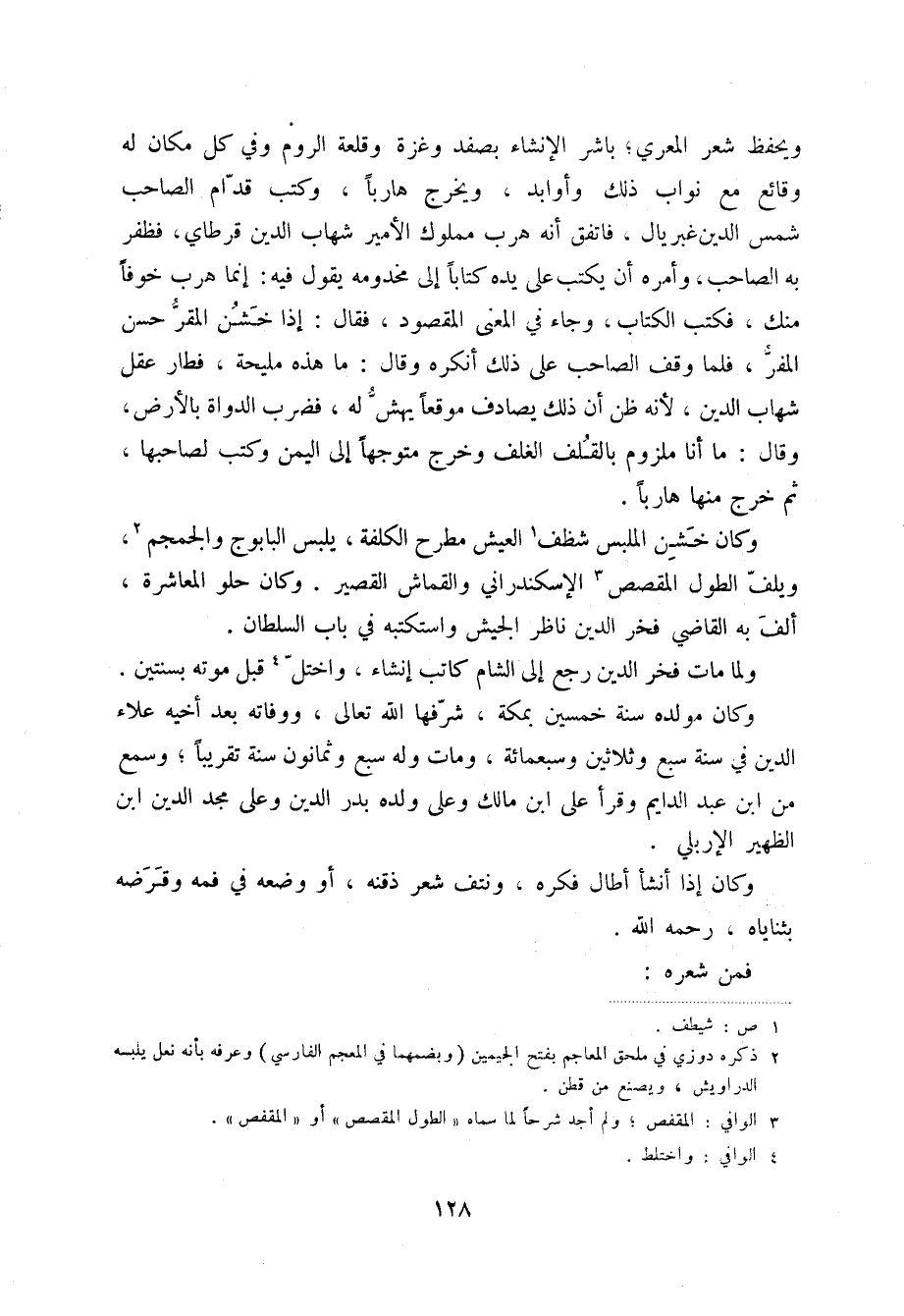 ويحفظ شعر المعري؛ باشر الإنشاء بصفد وغزة وقلعة الروم وفي كل مكان له وقائع مع نواب ذلك وأوابد، ويخرج هارباً، وكتب قدام الصاحب شمس الدين غبريال، فاتفق أنه هرب مملوك الأمير شهاب الدين قرطاي، فظفر به الصاحب، وأمره أن يكتب على يده كتاباً إلى مخدومه يقول فيه: إنما هرب خوفاً منك، فكتب الكتاب، وجاء في المعنى المقصود، فقال: إذا خشن المقر حسن المفر، فلما وقف الصاحب على ذلك أنكره وقال: ما هذه مليحة، فطار عقل شهاب الدين، لأنه ظن أن ذلك يصادف موقعاً يهش له، فضرب الدواة بالأرض، وقال: ما أنا ملزوم بالقلف الغلف وخرج متوجهاً إلى اليمن وكتب لصاحبها، ثم خرج منها هارباً.