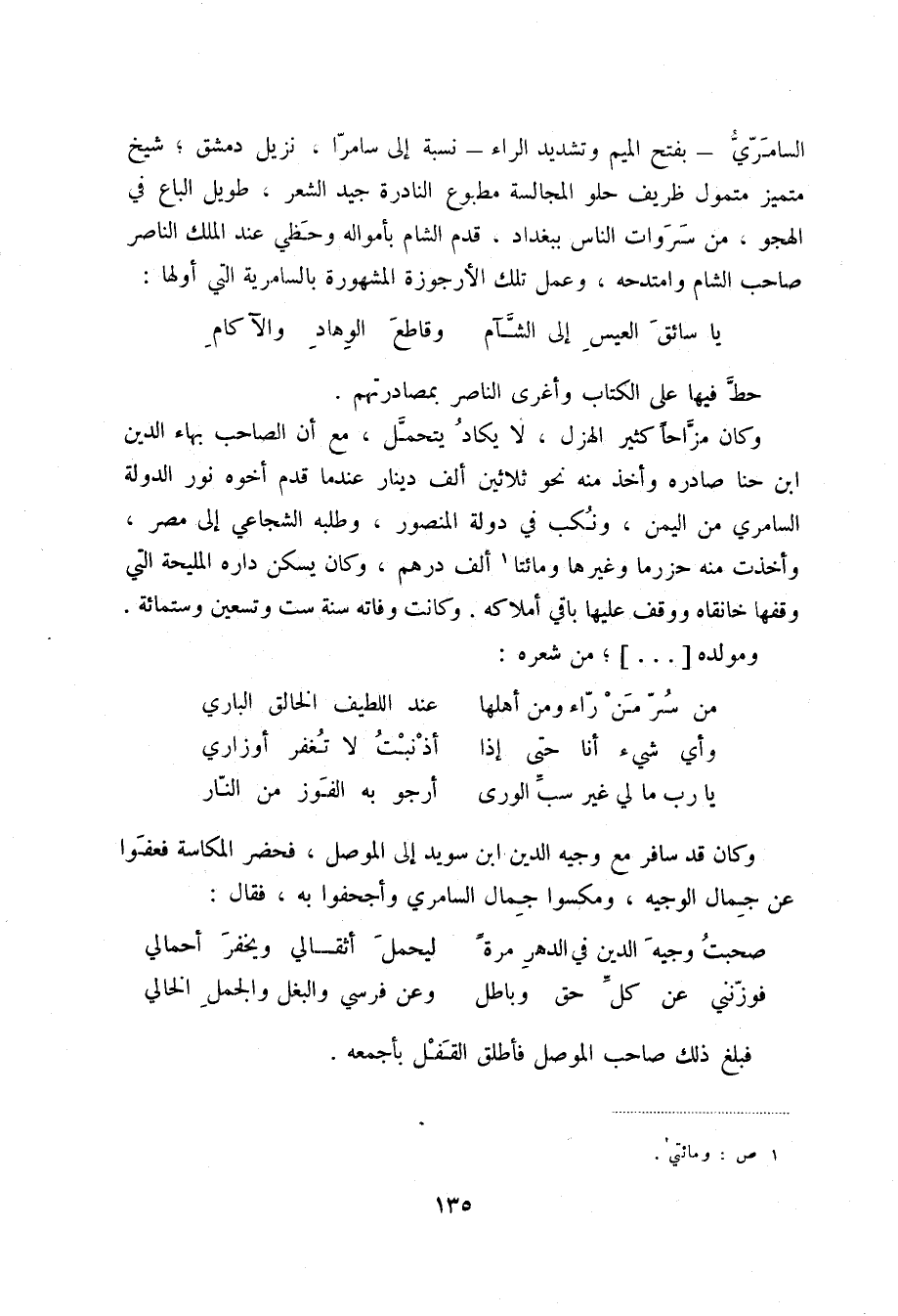 السامري - بفتح الميم وتشديد الراء - نسبة إلى سامرا، نزيل دمشق؛ شيخ متميز متمول ظريف حلو المجالسة مطبوع النادرة جيد الشعر، طويل الباع في الهجو، من سروات الناس ببغداد، قدم الشام بأمواله وحظي عند الملك الناصر صاحب الشام وامتدحه، وعمل تلك الأرجوزة المشهورة بالسامرية التي أولها: