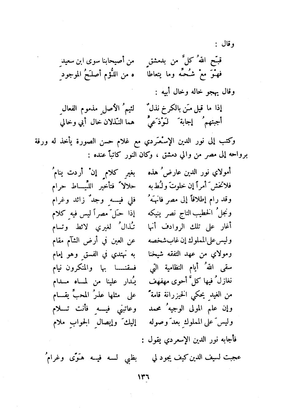 أجبتهم إجابة لوذعيٍّ ... هما النّذلان خال أبي وخالي وكتب إلى نور الدين الإسعردي مع غلام حسن الصورة يأخذ له ورقة برواحه إلى مصر من والي دمشق، وكان النور كاتباً عنده: