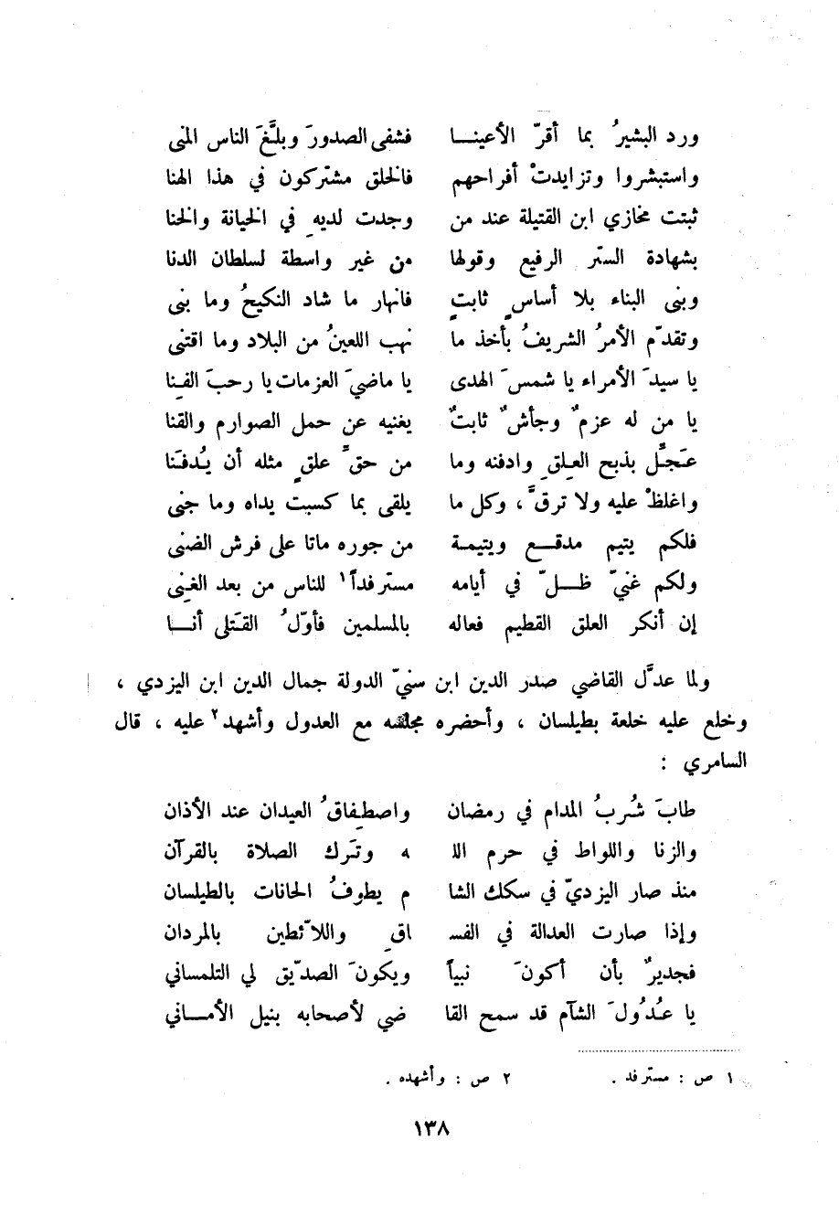 إن أنكر العلق القطيم فعاله ... بالمسلمين فأوّل القتلى أنا ولما عدل القاضي صدر الدين ابن سني الدولة جمال الدين ابن اليزدي، وخلع عليه خلعة بطيلسان، وأحضره مجلسه مع العدول وأشهد (2) عليه، قال السامري: