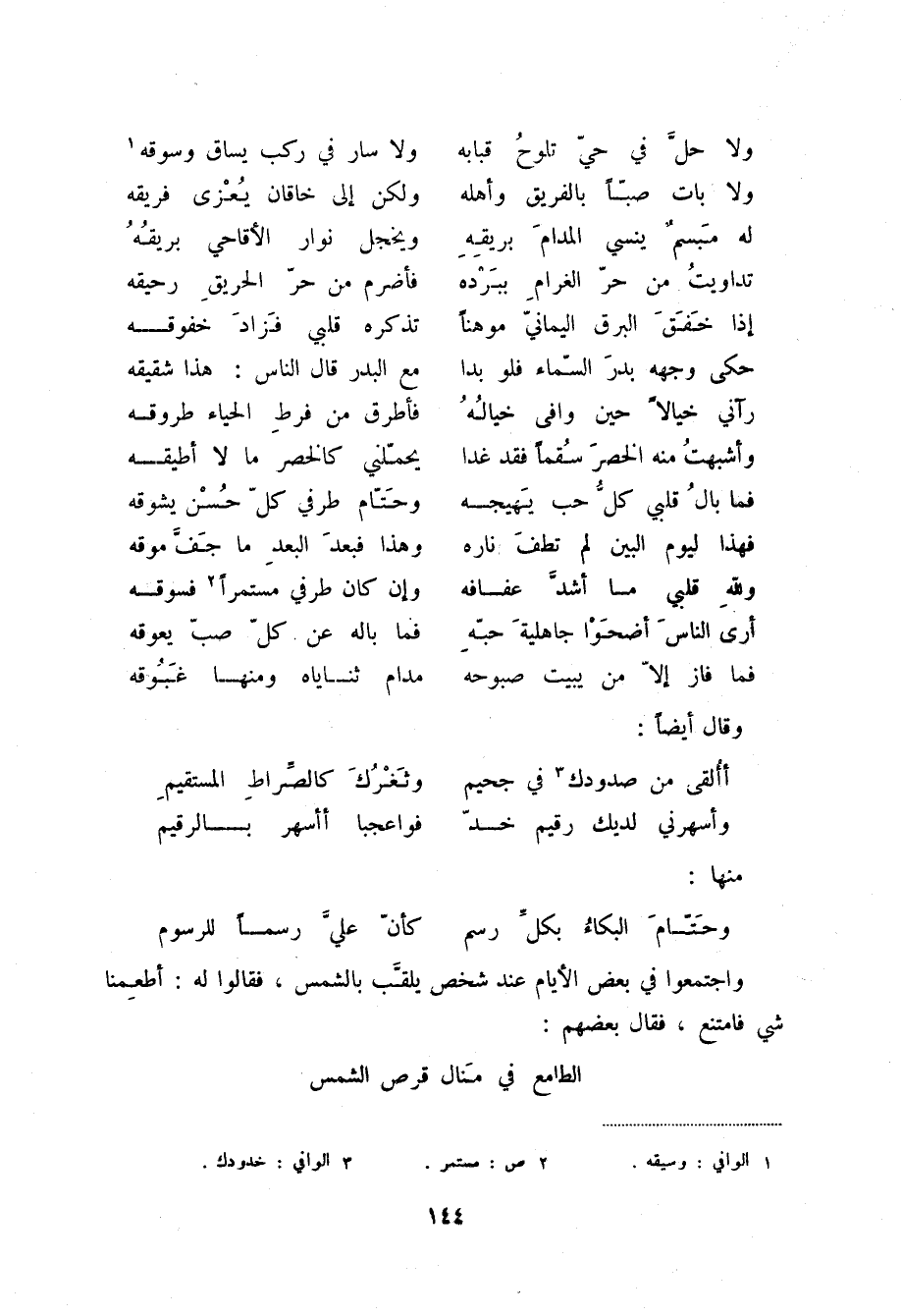 وحتّام البكاء بكلّ رسم ... كأنّ عليّ رسماً للرسوم واجتمعوا في بعض الأيام عند شخص يلقب بالشمس، فقالوا له: أطعمنا شي فامتنع، فقال بعضهم:
