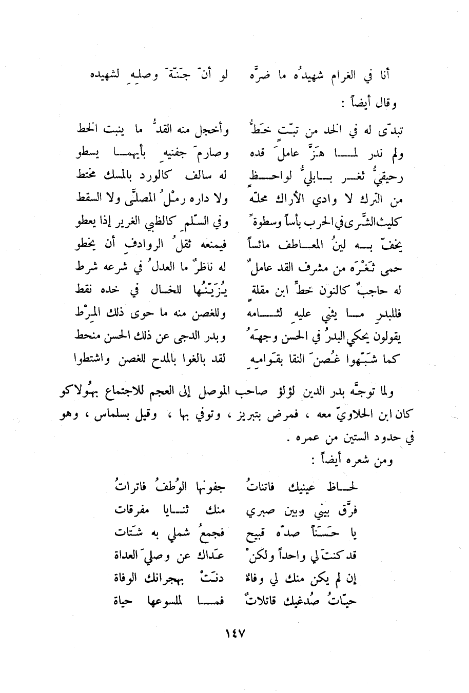 كما شبّهوا غصن النقا بقوامه ... لقد بالغوا بالمدح للغصن واشتطوا ولما توجه بدر الدين لؤلؤ صاحب الموصل إلى العجم للاجتماع بهولاكو كان ابن الحلاوي معه، فمرض بتبريز، وتوفي بها، وقيل بسلماس، وهو في حدود الستين من عمره.
