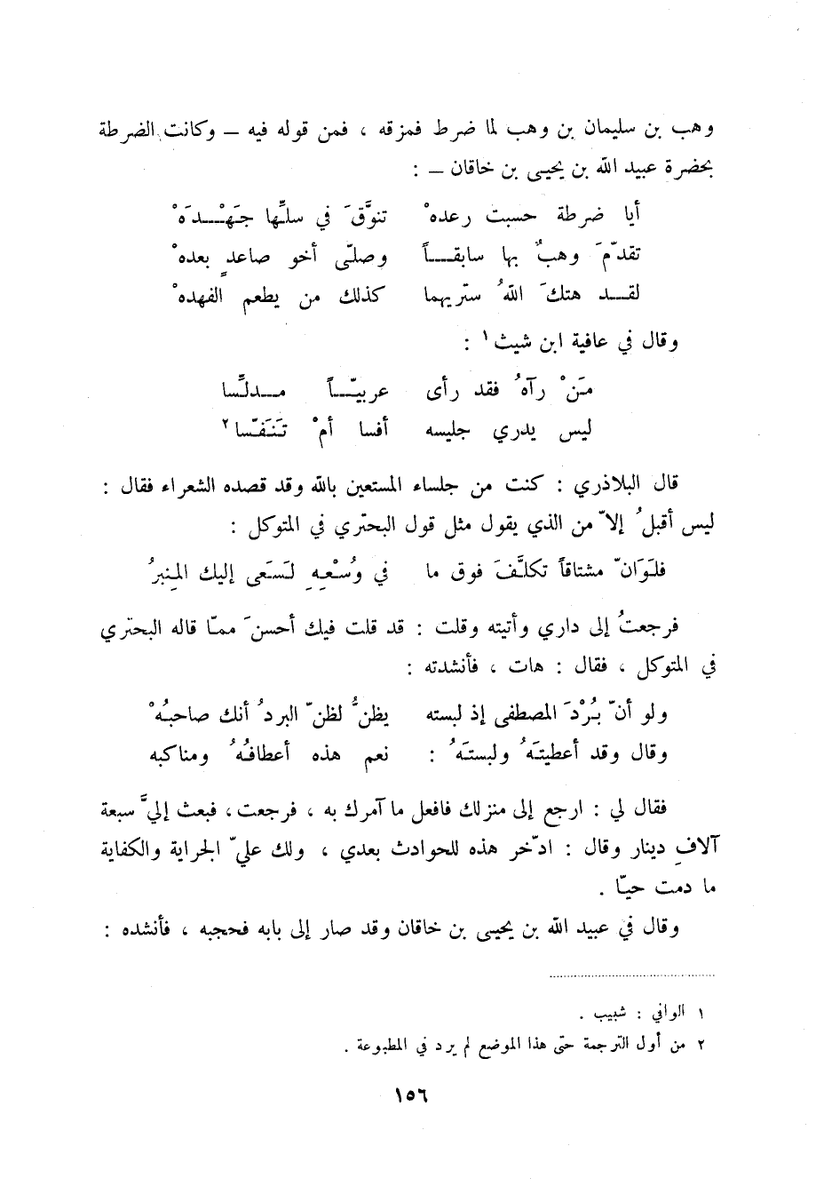 ليس يدري جليسه ... أفسا أم تنفّسا (2) قال البلاذري: كنت من جلساء المستعين بالله وقد قصده الشعراء فقال: ليس أقبل إلا من الذي يقول مثل قول البحتري في المتوكل: