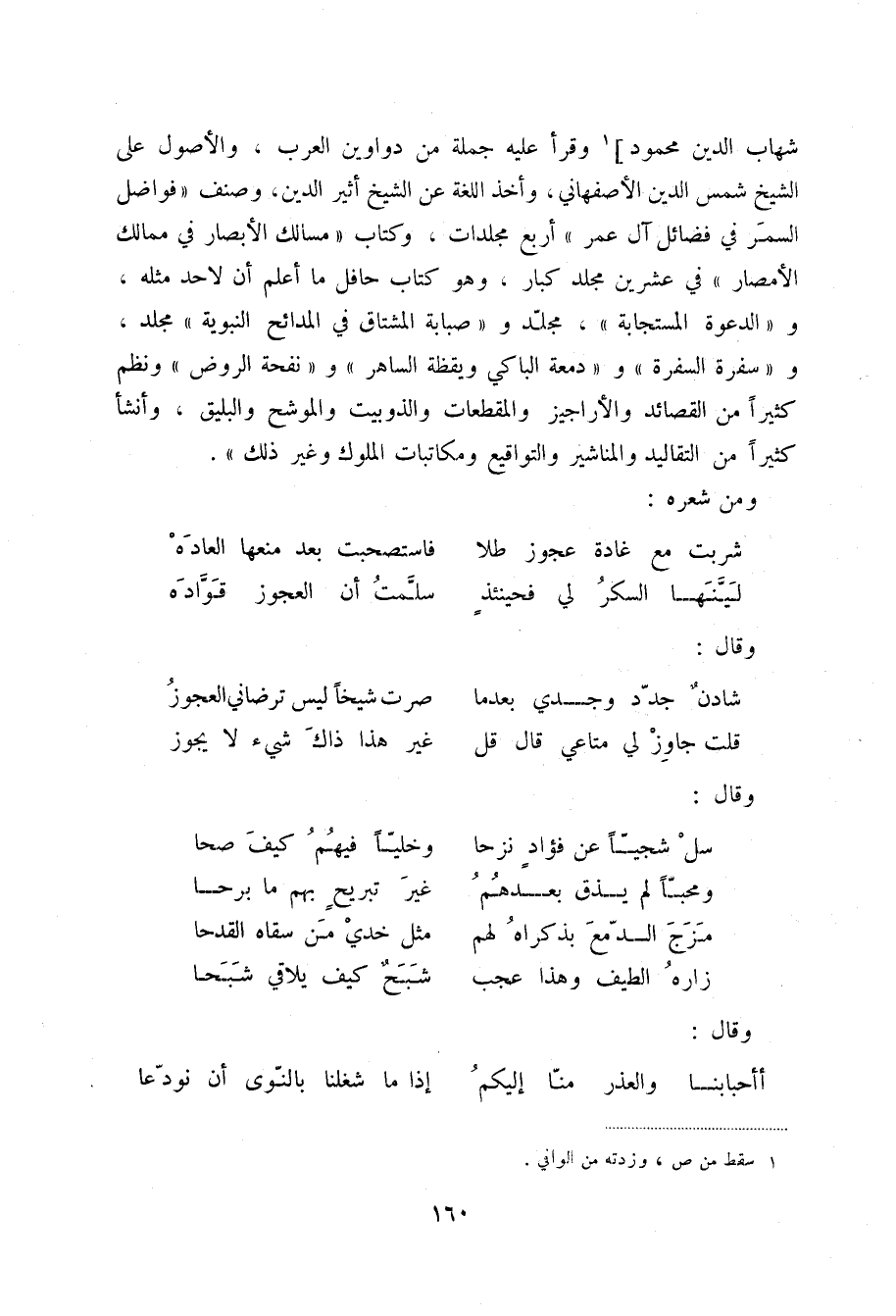 شهاب الدين محمود (1) وقرأ عليه جملة من دواوين العرب، والأصول على الشيخ شمس الدين الأصفهاني، وأخذ اللغة عن الشيخ أثير الدين، وصنف فواضل السمر في فضائل آل عمر أربع مجلدات، وكتاب مسالك الأبصار في ممالك الأمصار في عشرين مجلد كبار، وهو كتاب حافل ما أعلم أن لاحد مثله، والدعوة المستجابة، مجلد وصبابة المشتاق في المدائح النبوية مجلد، وسفرة السفرة ودمعة الباكي ويقظة الساهر ونفحة الروض ونظم كثيراً من القصائد والأراجيز والمقطعات والذوبيت والموشح والبليق، وأنشأ كثيراً من التقاليد والمناشير والتواقيع ومكاتبات الملوك وغير ذلك.