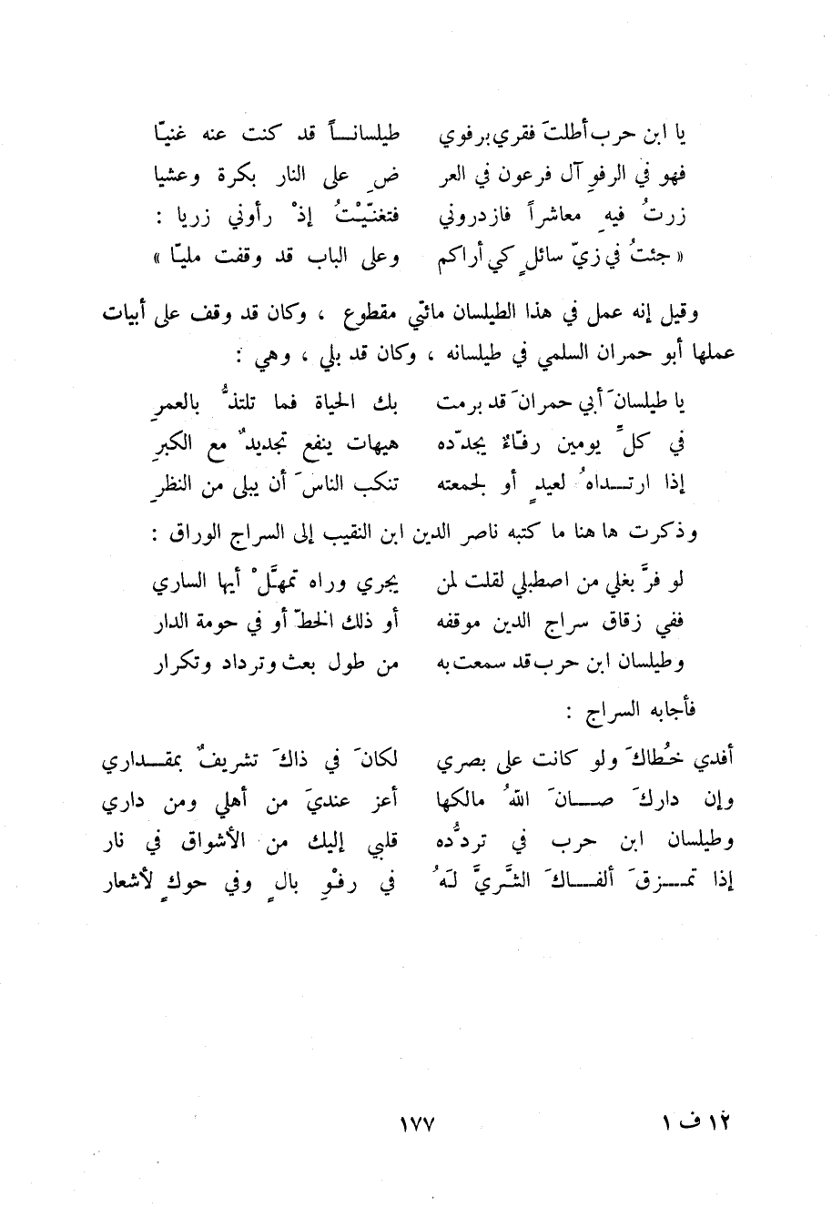 وطيلسان ابن حرب قد سمعت به ... من طول بعث وترداد وتكرار فأجابه السراج: