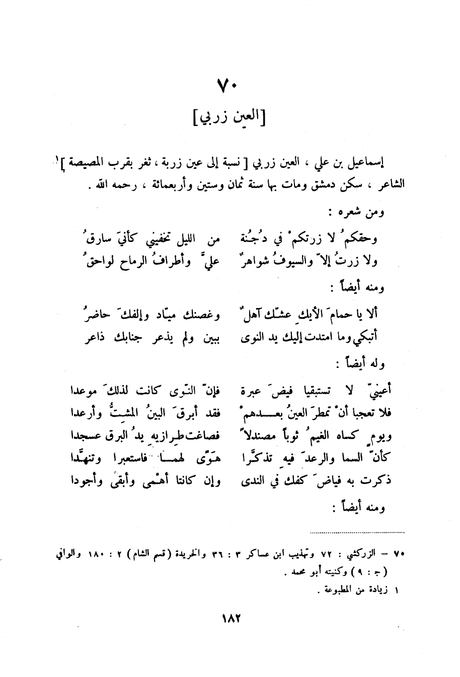 إسماعيل بن علي، العين زربي نسبة إلى عين زربة، ثغر بقرب المصيصة (2) الشاعر، سكن دمشق ومات بها سنة ثمان وستين وأربعمائة، رحمه الله.