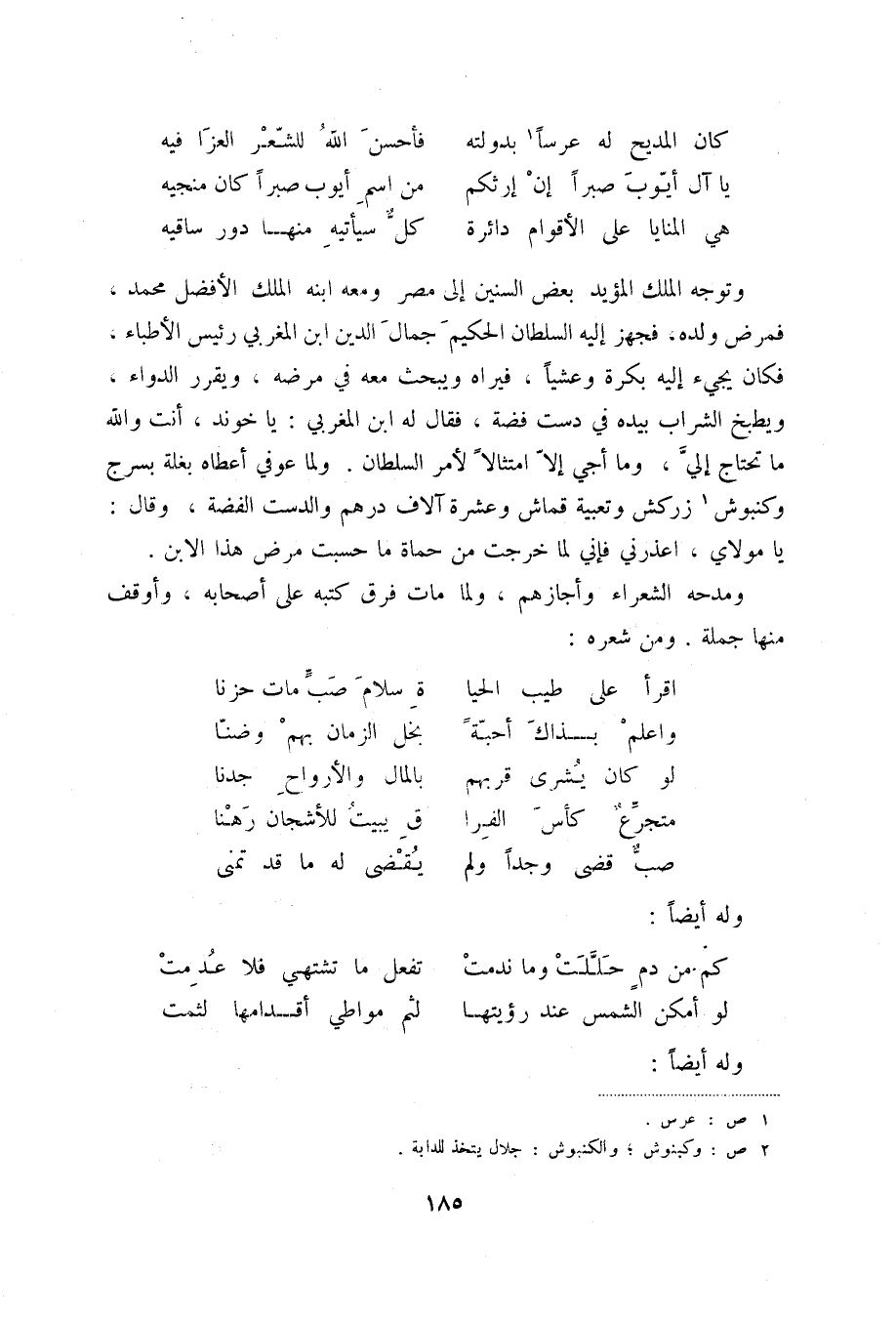 هي المنايا على الأقوام دائرة ... كلٌّ سيأتيه منها دور ساقيه وتوجه الملك المؤيد بعض السنين إلى مصر ومعه ابنه الملك الأفضل محمد، فمرض ولده، فجهز إليه السلطان الحكيم جمال الدين ابن المغربي رئيس الأطباء، فكان يجيء إليه بكرة وعشياً، فيراه ويبحث معه في مرضه، ويقرر الدواء، ويطبخ الشراب بيده في دست فضة، فقال له ابن المغربي: يا خوند، أنت والله ما تحتاج إلي، وما أجي إلا امتثالاً لأمر السلطان. ولما عوفي أعطاه بغلة بسرج وكنبوش (2) زركش وتعبية قماش وعشرة آلاف درهم والدست الفضة، وقال: يا مولاي، اعذرني فإني لما خرجت من حماة ما حسبت مرض هذا الابن.