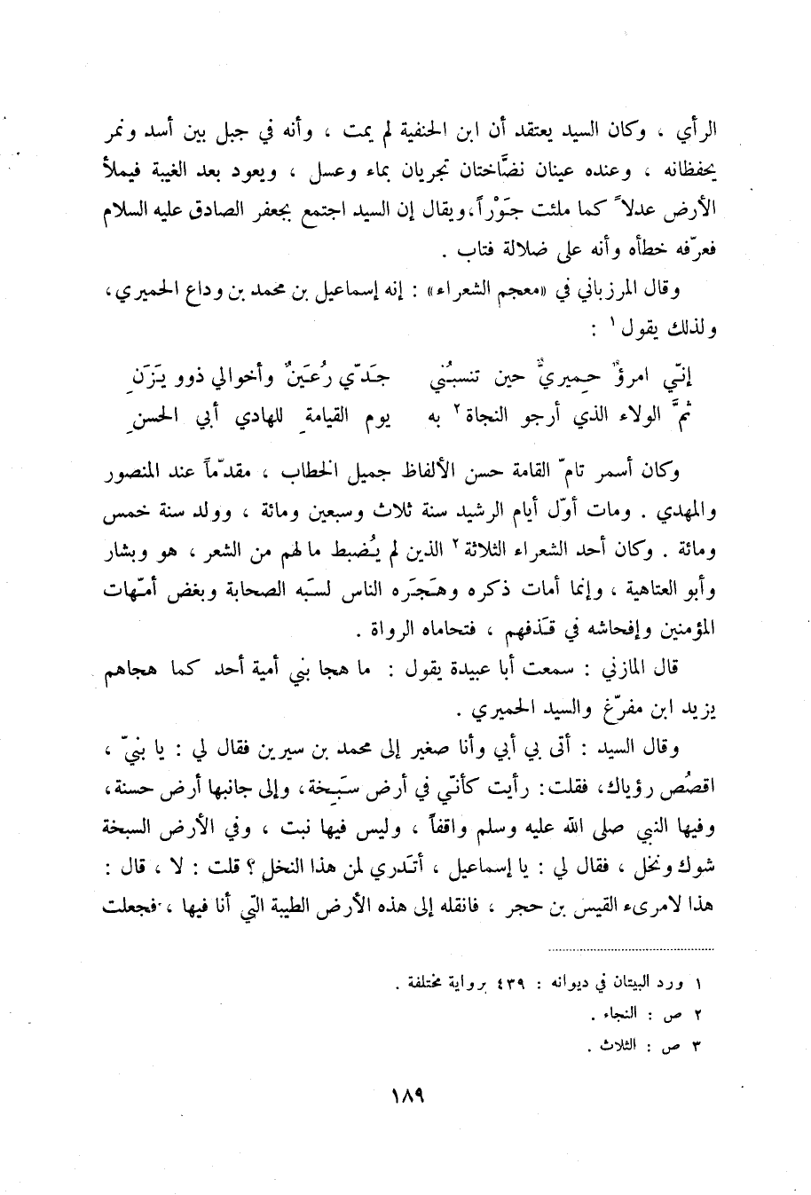 الرأي، وكان السيد يعتقد أن ابن الحنفية لم يمت، وأنه في جبل بين أسد ونمر يحفظانه، وعنده عينان نضاختان تجريان بماء وعسل، ويعود بعد الغيبة فيملأ الأرض عدلاً كما ملئت جوراً، ويقال إن السيد اجتمع بجعفر الصادق عليه السلام فعرفه خطأه وأنه على ضلالة فتاب.