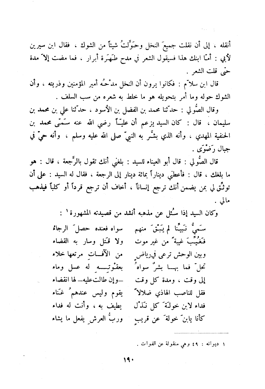وقال الصولي: حدثنا محمد بن الفضل بن الأسود، حدثنا علي بن محمد بن سليمان، قال: كان السيد يزعم أن علياً رضي الله عنه سمى محمد بن الحنفية المهدي، وأنه الذي بشر به النبي صلى الله عليه وسلم، وأنه حي في جبال رضوى.