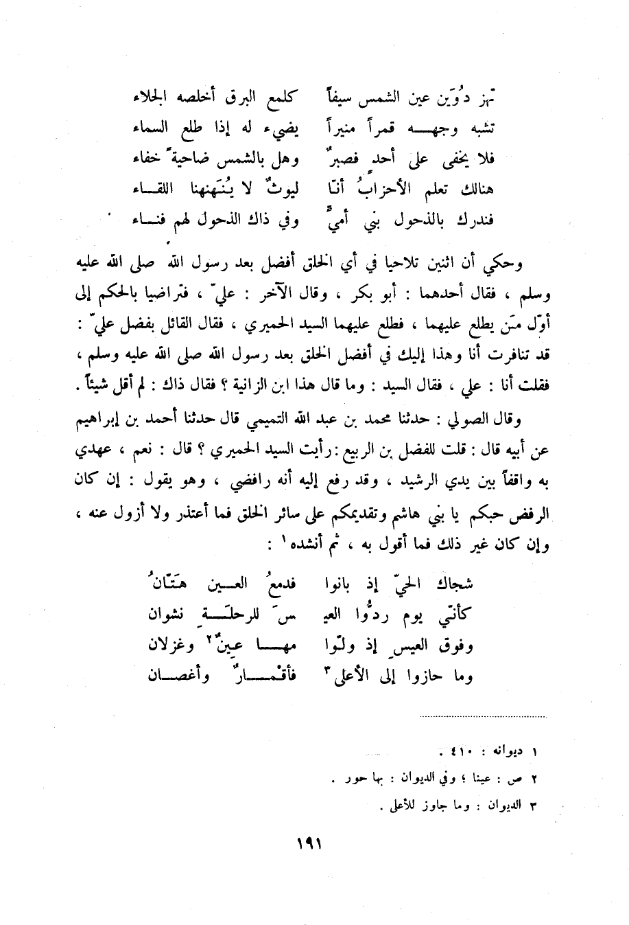 فندرك بالذحول بني أميٍّ ... وفي ذاك الذحول لهم فناء وحكي أن اثنين تلاحيا في أي الخلق أفضل بعد رسول الله صلى الله عليه وسلم، فقال أحدهما: أبو بكر، وقال الآخر: علي، فتراضيا بالحكم إلى أول من يطلع عليهما، فطلع عليهما السيد الحميري، فقال القائل بفضل علي: قد تنافرت أنا وهذا إليك في أفضل الخلق بعد رسول الله صلى الله عليه وسلم، فقلت أنا: علي، فقال السيد: وما قال هذا ابن الزانية؟ فقال ذاك: لم أقل شيئاً.