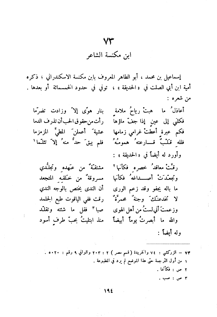 (1) الزركشي: 74 والخريدة (قسم مصر) 2: 203 والوافي 9 رقم: 5020.