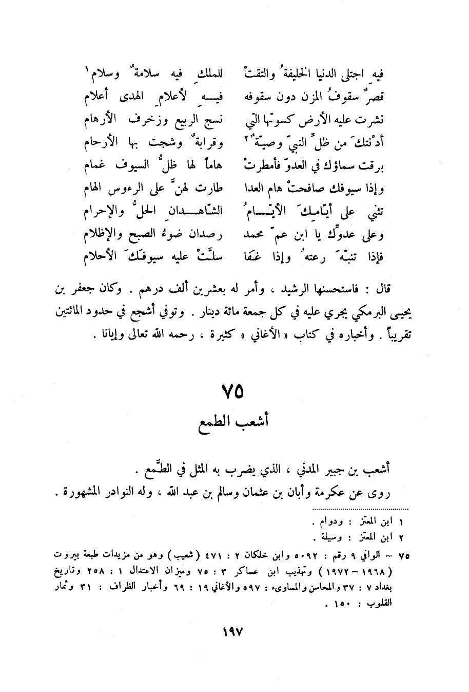 (3) الوافي 9 رقم: 5092 وابن خلكان 2: 471 (شعيب) وهو من مزيدات طبعة بيروت (1968 - 1972) وتهذيب ابن عساكر 3: 75 وميزان الاعتدال 1: 258 وتاريخ بغداد 7: 37 والمحاسن والمساوئ: 597 والأغاني 19: 69 وأخبار الظراف: 31 وثمار القلوب: 150.
