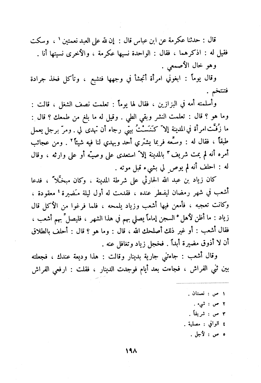 كان زياد بن عبد الله الحارثي على شرطة المدينة، وكان مبخلاً، فدعا أشعب في شهر رمضان ليفطر عنده، فقدمت له أول ليلة مضيرة (4) معقودة، وكانت تعجبه، فأمعن فيها أشعب وزياد يلمحه، فلما فرغوا من الأكل قال زياد: ما أظن لأهل (5) السجن إماماً يصلي بهم في هذا الشهر، فليصل بهم أشعب، فقال أشعب: أو غير ذلك أصلحك الله، قال: وما هو؟ قال: أحلف بالطلاق أن لا أذوق مضيرة أبداً. فخجل زياد وتغافل عنه.
