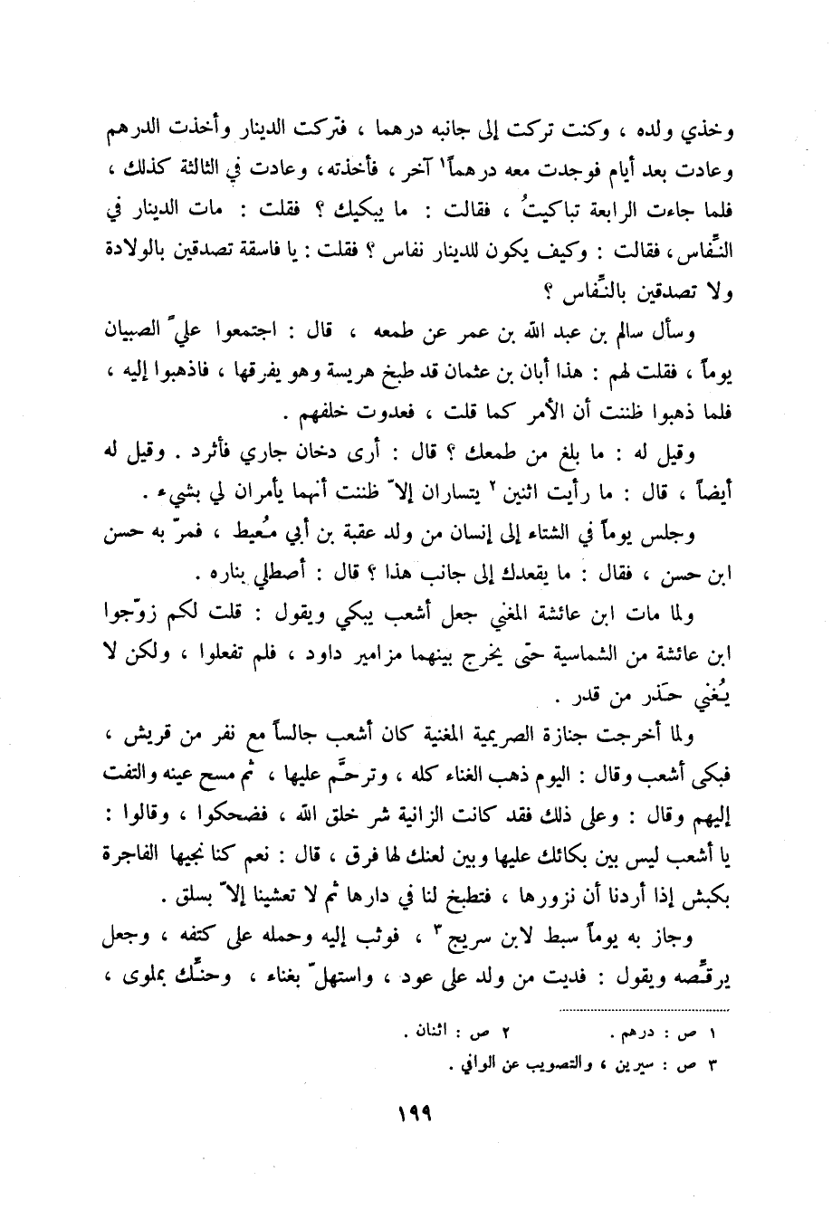وخذي ولده، وكنت تركت إلى جانبه درهماً، فتركت الدينار وأخذت الدرهم وعادت بعد أيام فوجدت معه درهماً (1) آخر، فأخذته، وعادت في الثالثة كذلك، فلما جاءت الرابعة تباكيت، فقالت: ما يبكيك؟ فقلت: مات الدينار في النفاس، فقالت: وكيف يكون للدينار نفاس؟ فقلت: يا فاسقة تصدقين بالولادة ولا تصدقين بالنفاس؟