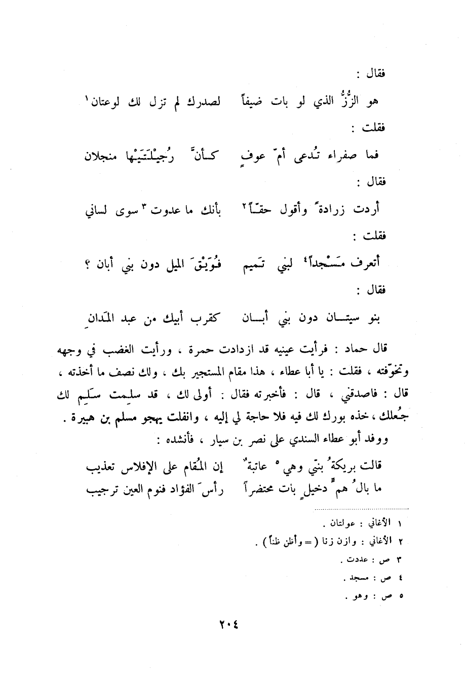 بنو سيتان دون بني أبان ... كقرب أبيك من عبد المدان قال حماد: فرأيت عينيه قد ازدادت حمرة، ورأيت الغضب في وجهه وتخوفته، فقلت: يا أبا عطاء، هذا مقام المستجير بك، ولك نصف ما أخذته، قال: فاصدقني، قال: فأخبرته فقال: أولى لك، قد سلمت سلم لك جعلك، خذه بورك لك فيه فلا حاجة لي إليه، وانفلت يهجو مسلم بن هبيرة.