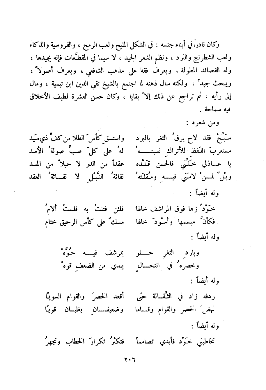 وكان نادر في أبناء جنسه: في الشكل المليح ولعب الرمح، والفروسية والذكاء ولعب الشطرنج والنرد، ونظم الشعر الجيد، لا سيما في المقطعات فإنه يجيدها، وله القصائد المطولة، ويعرف فقه على مذهب الشافعي، ويعف أصولاً، ويبحث جيداً، ولكنه سال ذهنه لما اجتمع بالشيخ تقي الدين ابن تيمية، ومال إلى رأيه، ثم تراجع عن ذلك إلا بقايا، وكان حسن العشرة لطيف الأخلاقي فيه سماحة.