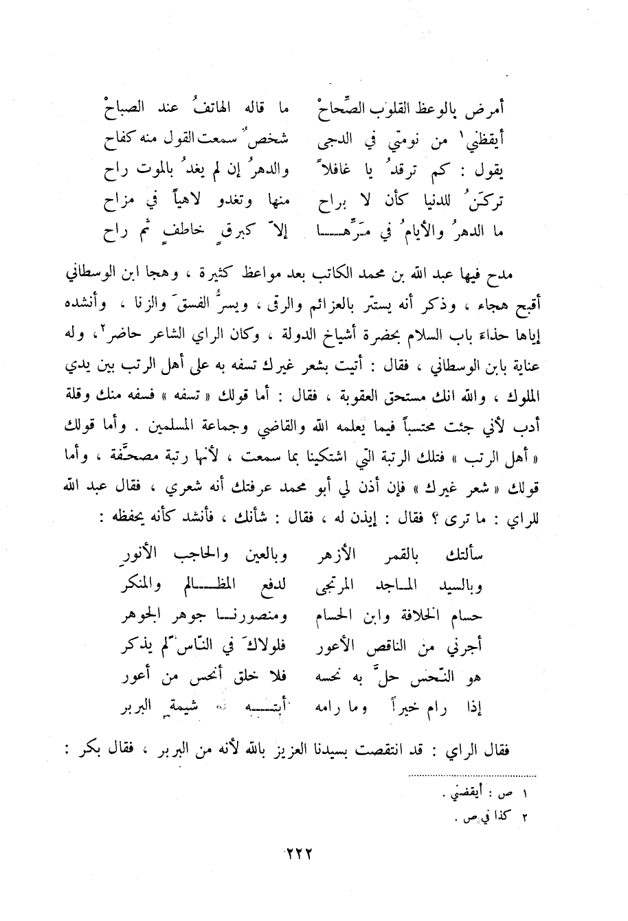 ما الدهر والأيام في مرّها ... إلاّ كبرقٍ خاطفٍ ثم راح مدح فيها عبد الله بن محمد الكاتب بعد مواعظ كثيرة، وهجا ابن الوسطاني أقبح هجاء، وذكر أنه يستتر بالعزائم والرقى، ويسر الفسق والزنا، وأنشده إياها حذاء باب السلام بحضرة أشياخ الدولة، وكان الراي الشاعر حاضر (2) ، وله عناية بابن الوسطاني، فقال: أتيت بشعر غيرك تسفه به على أهل الرتب بين يدي الملوك، والله إنك مستحق العقوبة، فقال: أما قولك تسفه فسفه منك وقلة أدب لأني جئت محتسباً فيما يعلمه الله والقاضي وجماعة المسلمين. وأما قولك أهل الرتب فتلك الرتبة التي اشتكينا بما سمعت، لأنها رتبة مصحفة، وأما قولك شعر غيرك فإن أذن لي أبو محمد عرفتك أنه شعري، فقال عبد الله للراي: ما ترى؟ فقال: إيذن له، فقال: شأنك، فأنشد كأنه يحفظه: