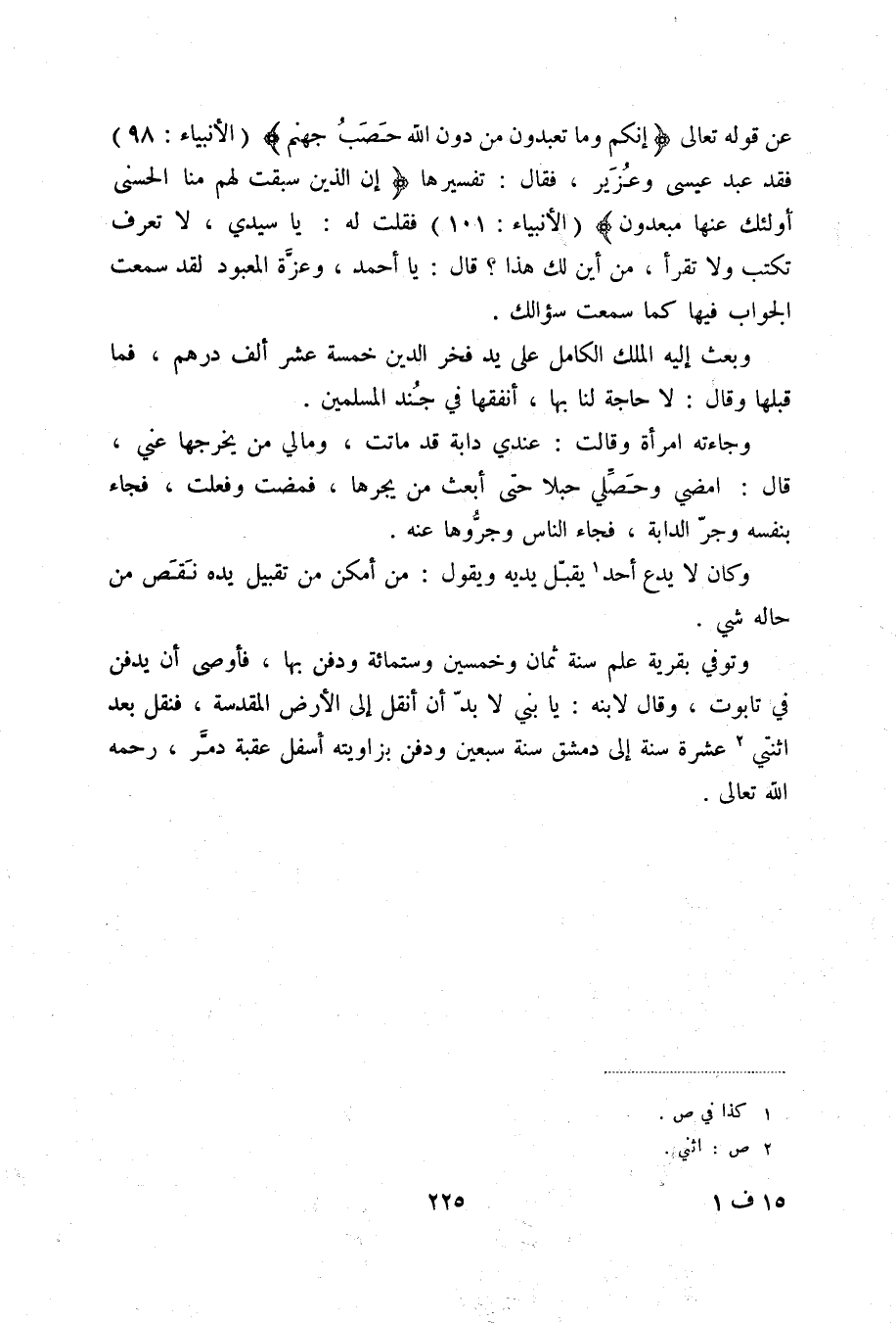 عن قوله " إنكم وما تعبدون من دون الله حَصَبُ جهنم " الأنبياء فقد عبد عيسى وعزير، فقال: تفسيرها " إن الذين سبقت لهم منا الحسنى أولئك عنها مبعدون " الأنبياء فقلت له: يا سيدي، لا تعرف تكتب ولا تقرأ، من أين لك هذا؟ قال: يا أحمد، وعزة المعبود لقد سمعت الجواب فيها كما سمعت سؤالك.