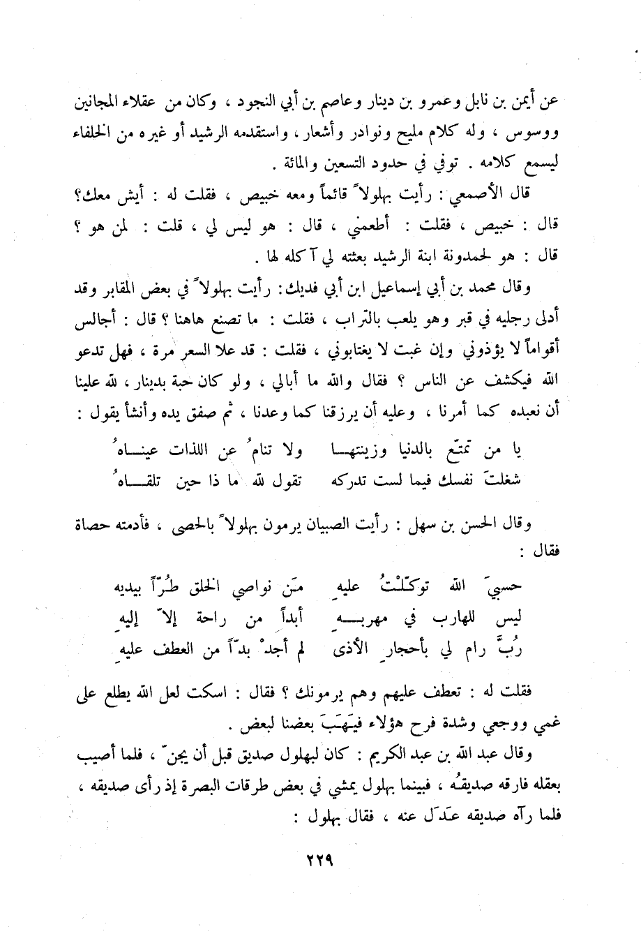 شغلت نفسك فيما لست تدركه ... تقول لله ماذا حين تلقاه وقال الحسن بن سهل: رأيت الصبيان يرمون بهلولاً بالحصى، فأدمته حصاة فقال:
