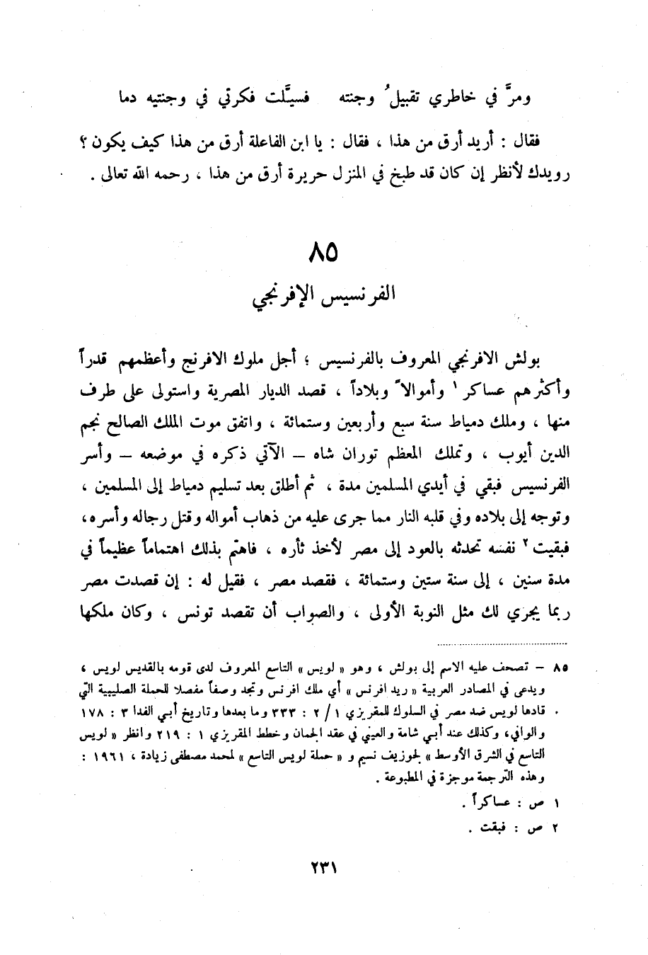 (1) تصحف عليه الاسم إلى بولش، وهو ((لويس)) التاسع المعروف لدى قومه بالقديس لويس، ويدعى في المصادر العربية ((ريد افرنس)) أي ملك افرنس وتجد وصفاً مفصلاً للحملة الصليبية التي قادها لويس ضد مصر في السلوك للمقريزي 1/ 2: 333 وما بعدها وتاريخ أبي الفدا 3: 178 والوافي، وكذلك عند أبي شامة والعيني في عقد الجمان وخطط المقريزي 1: 219 وانظر ((لويس التاسع في الشرق الأوسط)) لجوزيف نسيم و ((حملة لويس التاسع)) لمحمد مصطفى زيادة، 1961: وهذه الترجمة موجزة في المطبوعة.