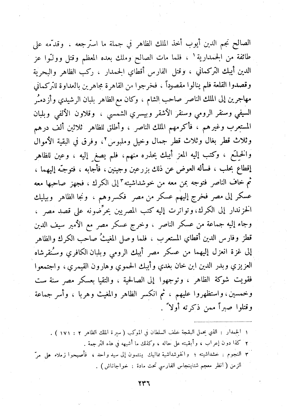 الصالح نجم الدين أيوب أخذ الملك الظاهر في جملة ما استرجعه، وقدمه على طائفة من الجمدارية (1) ، فلما مات الصالح وملك بعده المعظم وقتل وولوا عز الدين أيبك التركماني، وقتل الفارس أقطاي الجمدار، ركب الظاهر والبحرية وقصدوا القلعة فلم ينالواً مقصوداً، فخرجوا من القاهرة مجاهرين بالعداوة للتركماني مهاجرين إلى الملك الناصر صاحب الشام، وكان مع الظاهر بلبان الرشيدي وأزدمر السيفي وسنقر الأشقر وبيسري الشمسي، وقلاون الألفي وبلبان المستعرب وغيرهم، فأكرمهم الملك الناصر، وأطلق للظاهر ثلاثين ألف درهم وثلاث قطر بغال وثلاث قطر جمال وخيل وملبوس (2) ، وفرق في البقية الأموال والخلع، وكتب إليه المعز أيبك يحذره منهم، فلم يصغ إليه، وعين للظاهر إقطاع بحلب، فسأله العوض عن ذلك بزرعين وجينين، فأجابه، فتوجه إليهما، ثم خاف الناصر فتوجه بمن معه من خوشداشيته (3) إلى الكرك، فجهز صاحبها معه عسكر إلى مصر فخرج إليهم عسكر من مصر فكسروهم، ونجا الظاهر وبيليك الخزندار إلى الكرك، وتواترت إليه كتب المصريين يحرضونه على قصد مصر، وجاء إليه جماعة من عسرك الناصر، وخرج عسكر مصر مع الأمير سيف الدين قطز وفارس الدين أقطاي المستعرب، فلما وصل المغيث صاحب الكرك والظاهر إلى غزاة انعزل إليهما من عسكر مصر أيبك الرومي وبلبان الكافري وسنقرشاه العزيزي وبدر الدين ابن خان بغدي وأيبك الحموي وهارون القيمري، واجتمعوا فقويت شوكة الظاهر، وتوجهوا إلى الصالحية، والتقيا بعسكر مصر سنة ست وخمسين، واستظهروا عليهم، ثم انكسر الظاهر والمغيث وهربا، وأسر جماعة وقتلوا صبراً ممن ذكرته أولاً.