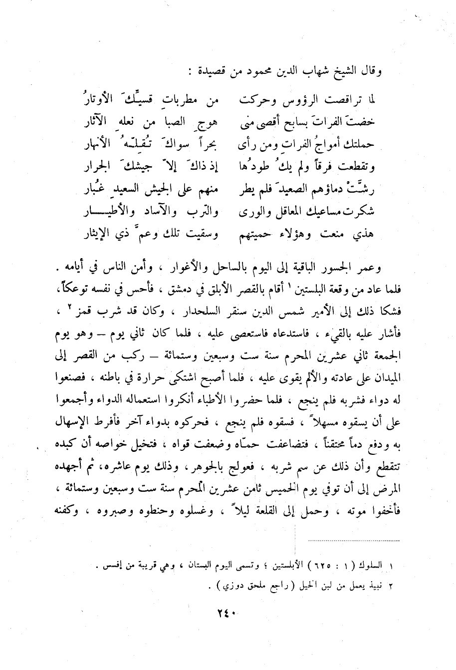 هذي منعت وهؤلاء حميتهم ... وسقيت تلك وعمّ ذي الإيثار وعمر الجسور الباقية إلى اليوم بالساحل والأغوار، وأمن الناس في أيامه. فلما عاد من وقعة البلستين (1) أقام بالقصر الأبلق في دمشق، فأحس في نفس توعكاً، فشكا ذلك إلى الأمير شمس الدين سنقر السلحدار، وكان قد شرب قمز (2) ، فأشار عليه بالقيء، فاستدعاه فاستعصى عليه، فلما كان ثاني يوم وهو يوم الجمعة ثاني عشرين المحرم سنة ست وسبعين وستمائة ركب من القصر إلى الميدان على عادته والألم يقوى عليه، فلما أصبح اشتكى حرارة في باطنه، فصنعوا له دواء فشربه فلم ينجع، فلما حضروا الأطباء أنكروا استعماله الدواء وأجمعوا على أن يسقوه مسهلاً، فسقوه فلم ينجع، فحركوه بدواء آخر فأفرط الإسهال به ودفع دماً محتقناً، فتضاعفت حماه وضعفت قواه، فتخيل خواصه أن كبده تتقطع وأن ذلك عن سم شربه، فعولج بالجوهر، وذلك يوم عاشره، ثم أجهده المرض إلى أن توفي يوم الخميس ثامن عشرين المحرم سنة ست وسبعين وستمائة، فأخفوا موته، وحمل إلى القلعة ليلاً، وغسلوه وحنطوه وصبروه، وكفنه