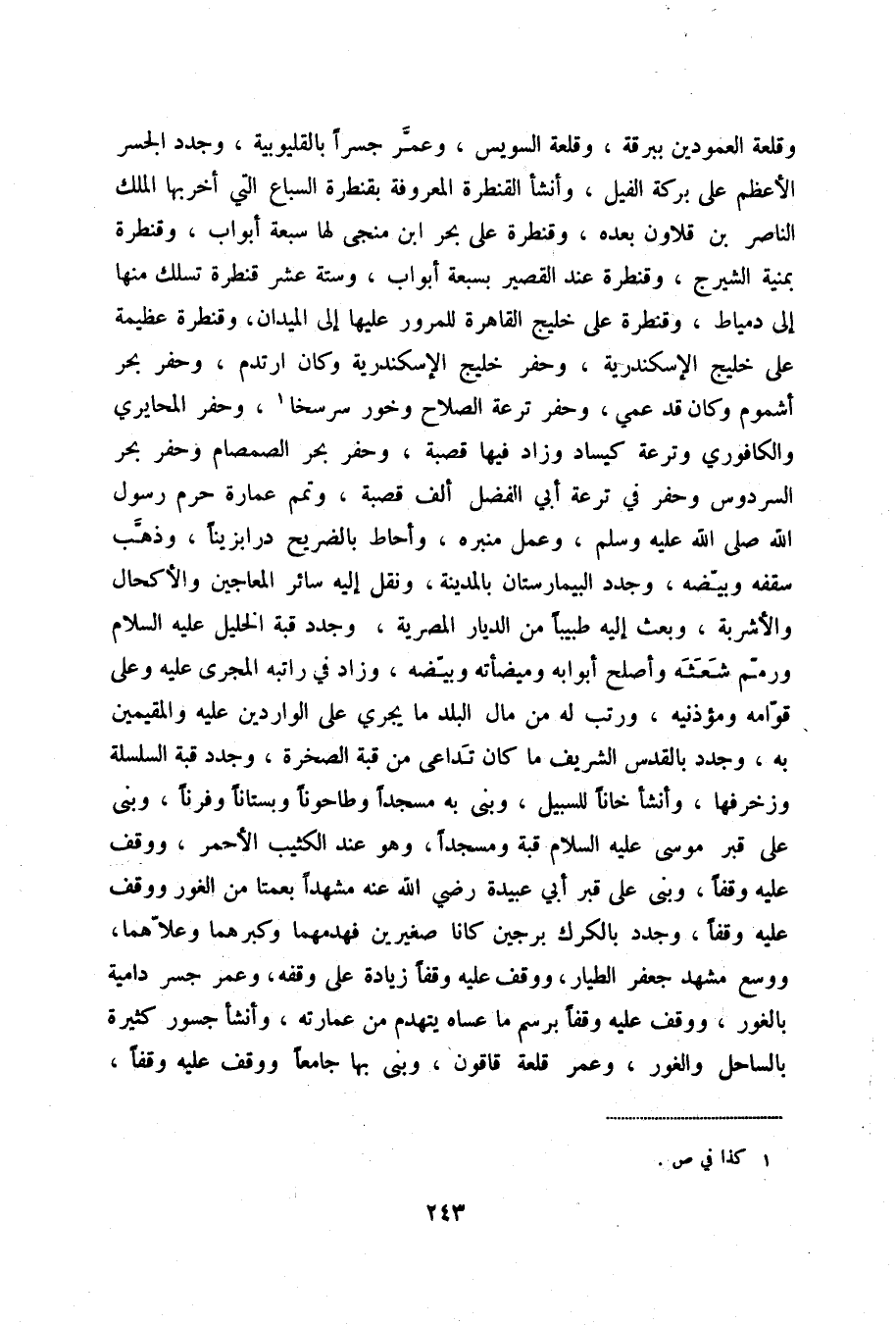 وقلعة العمودين ببرقة، وقلعة السويس، وعمر جسراً بالقليوبية، وجدد الجسر الأعظم على بركة الفيل، وأنشأ القنطرة المعروفة بقنطرة السباع التي أخربها الملك الناصر بن قلاون بعده، وقنطرة على بحر ابن منجى لها سبعة أبواب، وقنطرة بمنية الشيرج، وقنطرة عند القصير بسبعة أبواب، وستة عشر قنطرة تسلك منها إلى دمياط، وقنطرة على خليج القاهرة للمرور عليها إلى الميدان، وقنطرة عظيمة على خليج الإسكندية، وحفر خليج الإسكندرية وكان ارتدم، وحفر بحر أشموم وكان قد عمي، وحفر ترعة الصلاح وخور سرسخا (1) ، وحفر المحايري والكافوري وترعة كيساد وزاد فيها قصبة، وحفر بحر الصمصام وحفر بحر السردوس وحفر في ترعة أبي الفضل ألف قصبة، وتمم عمارة حرم رسول الله صلى الله عليه وسلم، وعمل منبره، وأحاط بالضريح درابزيناً، وذهب سقفه وبيضه، وجدد البيمارستان بالمدينة، ونقل إليه سائر المعاجين والأكحال والأشربة، وبعث إليه طبيباً من الديار المصرية، وجدد قبة الخليل عليه السلام ورمم شعثه وأصلح أبوابه وميضأته وبيضه، وزاد في راتبه المجرى عليه وعلى قوامه ومؤذنيه، ورتب له من مال البلد ما يجري على الواردين عليه والمقيمين به، وجدد بالقدس الشريف ما كان تداعى من قبة الصخرة، وجدد قبة السلسلة وزخرفها، وأنشأ خاناً للسبيل، وبنى به مسجداً وطاحوناً وبستاناً وفرناً، وبنى على قبر موسى عليه السلام قبة ومسجداً، وهو عند الكثيب الأحمر، ووقف عليه وقفاً، وبنى على قبر أبي عبيدة رضي الله عنه مشهداً بعمتا من الغور ووقف عليه وقفاً، وجدد بالكرك برجين كانا صغيرين فهدمهما وكبرهما وعلاهما، ووسع مشهد جعفر الطيار، ووقف عليه وقفاً زيادة على وقفه، وعمر جسر دامية بالغور، ووقف عليه وقفاً برسم ما عساه يتهدم من عمارته، وأنشأ جسور كثيرة بالساحل والغور، وعمر قلعة قاقون، وبنى بها جامعاً ووقف عليه وقفاً،