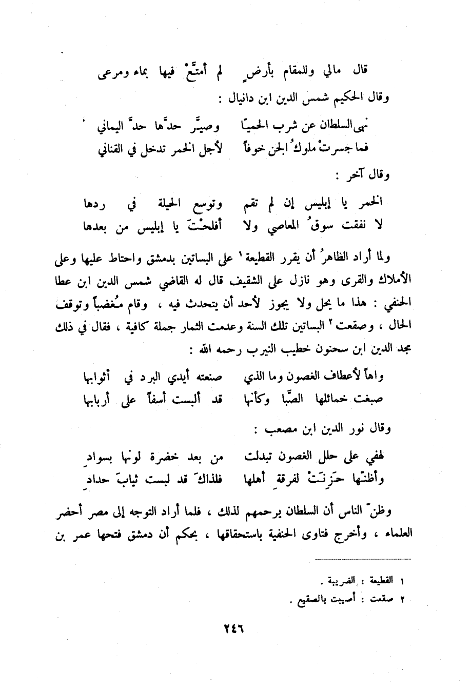 لا نفقت سوق المعاصي ولا ... أفلحت يا إبليس من بعدها ولما أراد الظاهر أن يقرر القطيعة (1) على البساتين بدمشق واحتاط عليها وعلى الأملاك والقرى وهو نازل على الشقيف قال له القاضي شمس الدين ابن عطا الحنفي: هذا ما يحل ولا يجوز لأحد أن يتحدث فيه، وقام مغضباً وتوقف الحال، وصقعت (2) البساتين تلك السنة وعدمت الثمار جملة كافية، فقال في ذلك مجد الدين ابن سحنون خطيب النيرب رحمه الله: