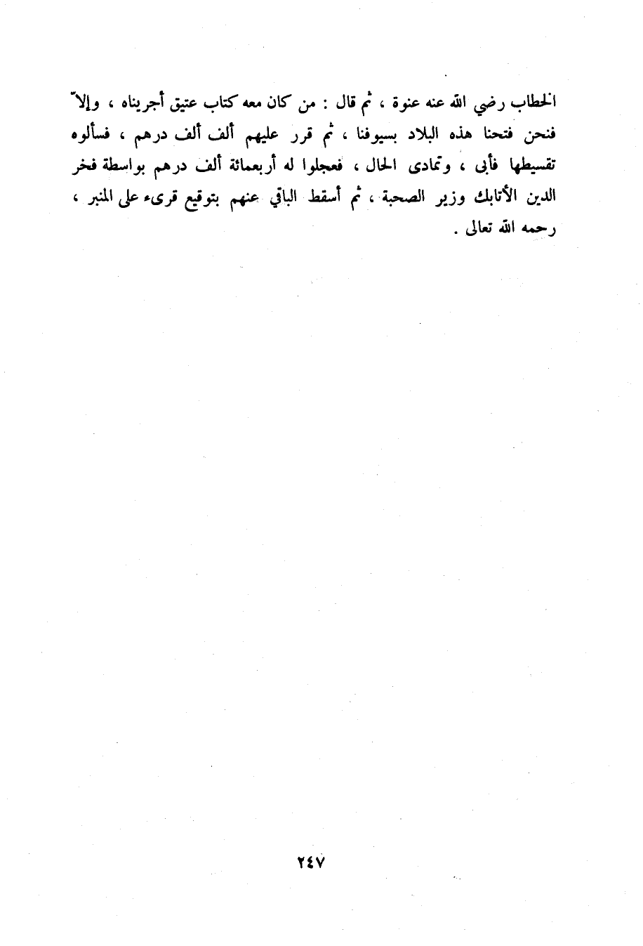 الخطاب رضي الله عنه عنوة، ثم قال: من كان معه كتاب عتيق أجريناه، وإلا فنحن فتحنا هذه البلاد بسيوفنا، ثم قرر عليهم ألف ألف درهم، فسألوه تقسيطها فأبى، وتمادى الحال، فعجلوا له أربعمائة ألف درهم بواسطة فخر الدين الأتابك وزير الصحبة، ثم أسقط الباقي عنهم بتوقيع قرىء على المنبر، رحمه الله تعالى.