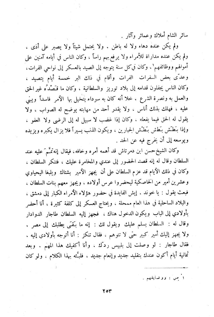 ولم يكن عنده دهاء ولا له باطن، ولا يحتمل شيئاً ولا يصبر على أذى، ولم يكن عنده مداراة للأمراء ولا يرفع بهم راساً، وكان الناس في أيامه آمنين على أموالهم ووظائفهم (1) ، وكان في كل سنة يتوجه إلى الصيد بالعسكر إلى نواحي الفرات، وعدى بعض السفرات الفرات وأقام في ذلك البر خمسة أيام يتصيد، وكان الناس يجفلون قدامه إلى بلاد توريز والسلطانية، وكان ما قصده غير الحق والعمل به ونصرة الشرع. خلا أنه كان به سوداء يتخيل بها الأمر فاسداً ويبني عليه، فهلك بذلك أناس، ولا يقدر أحد من مهابته يوضح له الصواب، ولا يقول له الحق فيما يفعله، وكان إذا غضب لا سبيل له إلى الرضى ولا العفو، وإذا بطش بطش بطش الجبارين، ويكون الذنب يسيراً فلا يزال يكبره ويزيده ويوسعه إلى أن يخرج فيه عن الحد.