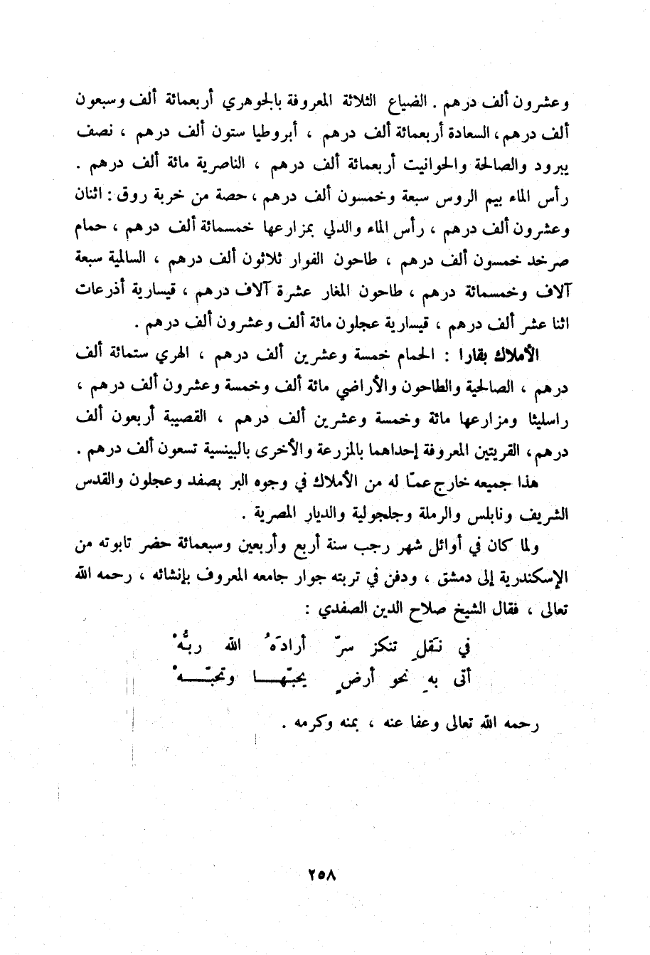هذا جميعه خارج عما له من الأملاك في وجوه البر بصفد وعجلون والقدس الشريف ونابلس والرملة وجلجولية والديار المصرية.