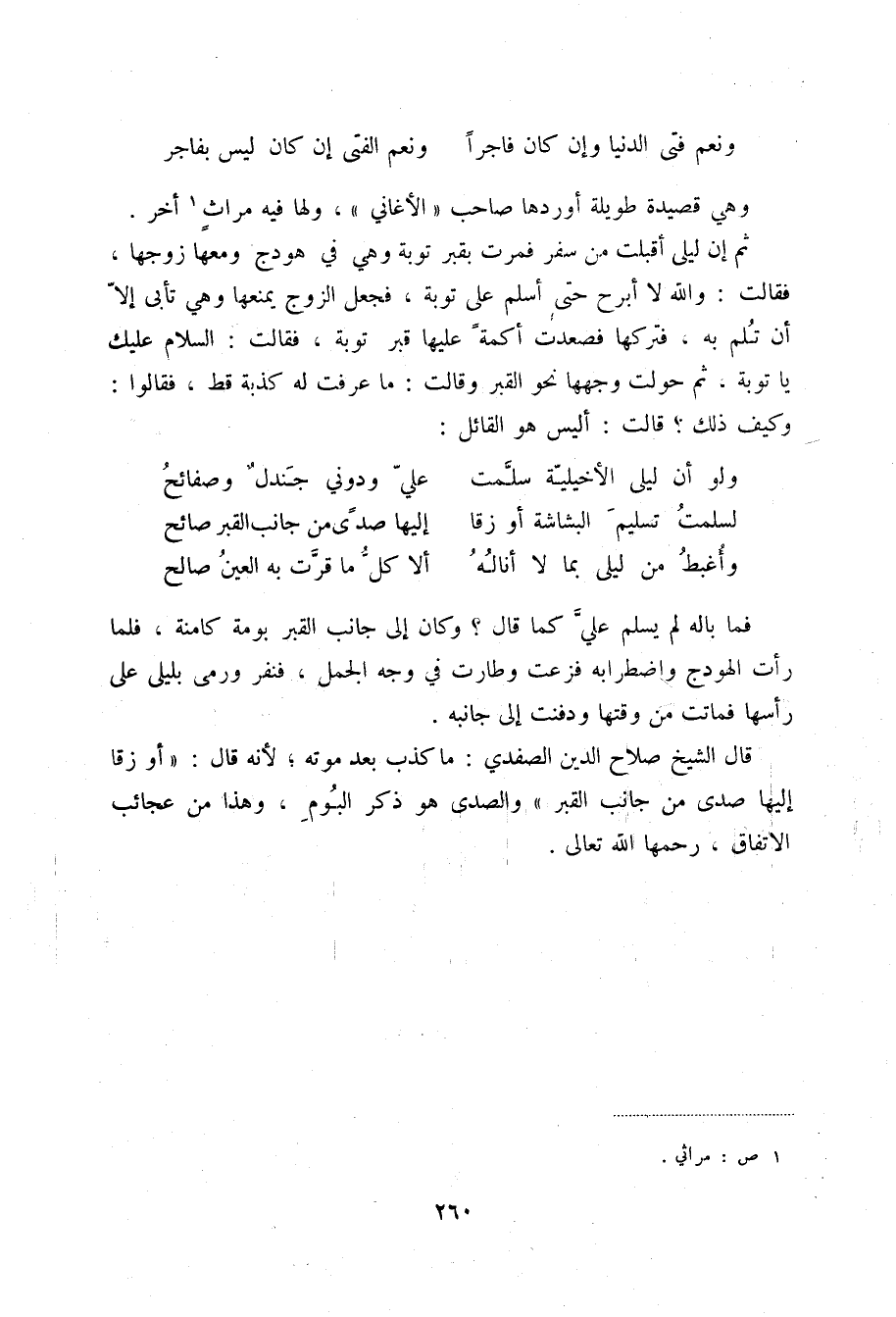 قال الشيخ صلاح الدين الصفدي: ما كذب بعد موته؛ لأنه قال: أو زقا إليها صدى من جانب القبر والصدى هو ذكر البوم، وهذا من عجائب الاتفاق، رحمها الله تعالى.