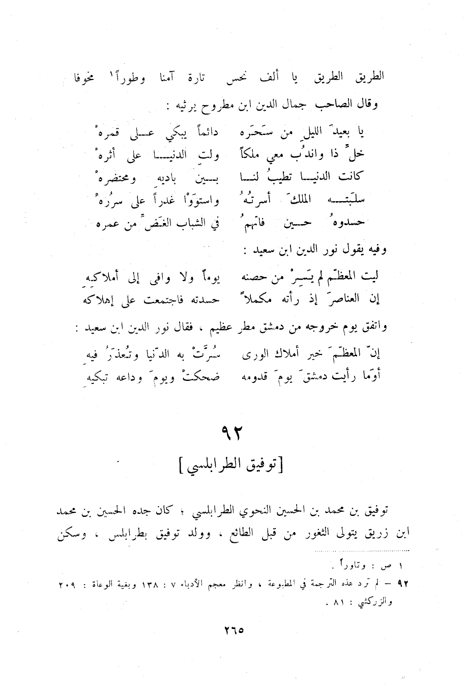 الطريق الطريق يا ألف نحس ... تارة آمنا وطوراً (1) مخوفا وقال الصاحب جمال الدين ابن مطروح يرثيه: