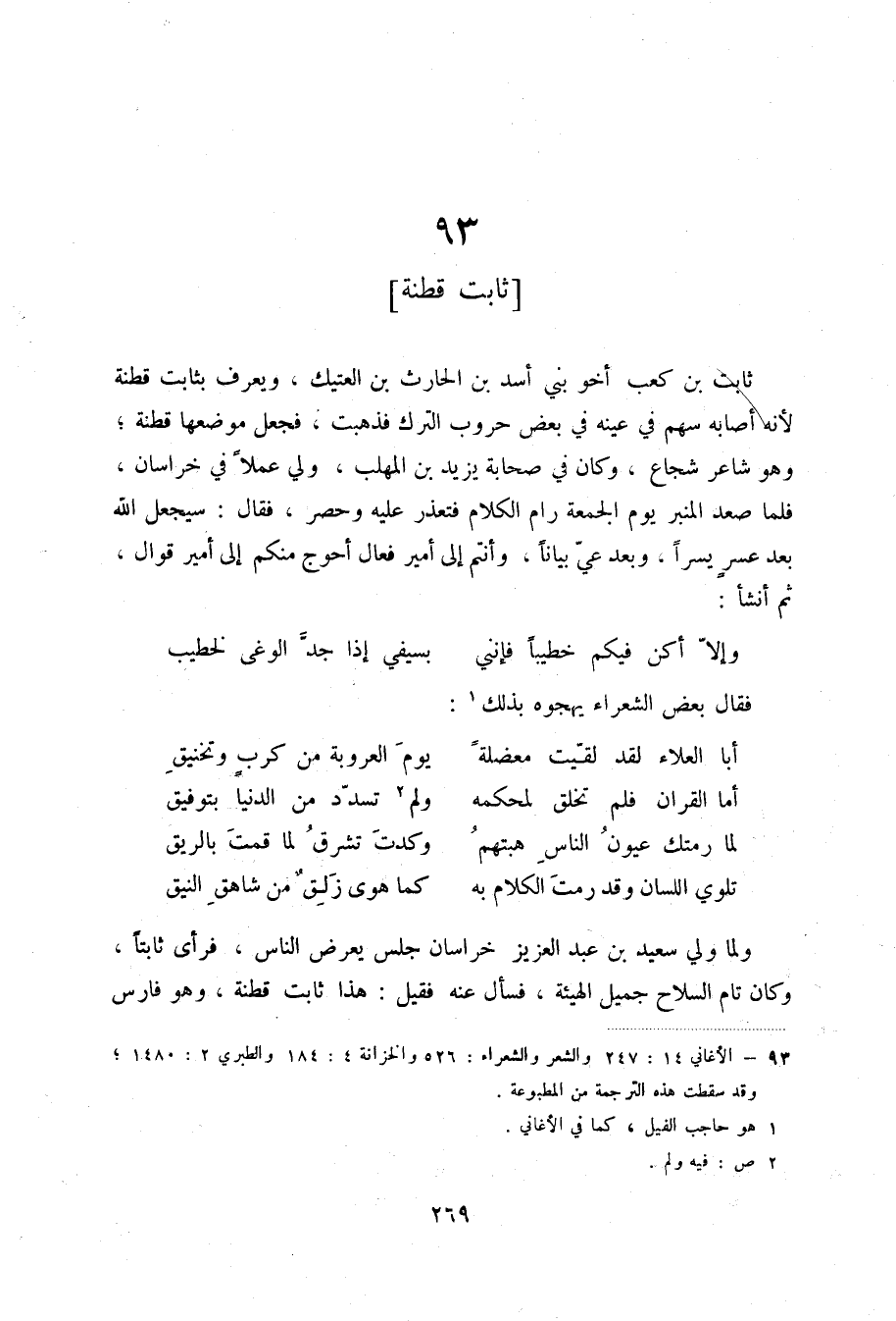تلوي اللسان وقد رمت الكلام به ... كما هوى زلقٌ من شاهق النيق ولما ولي سعيد بن عبد العزيز خراسان جلس يعرض الناس، فرأى ثابتاً، وكان تام السلاح جميل الهيئة، فسأل عنه فقيل: هذا ثابت قطنة، وهو فارس