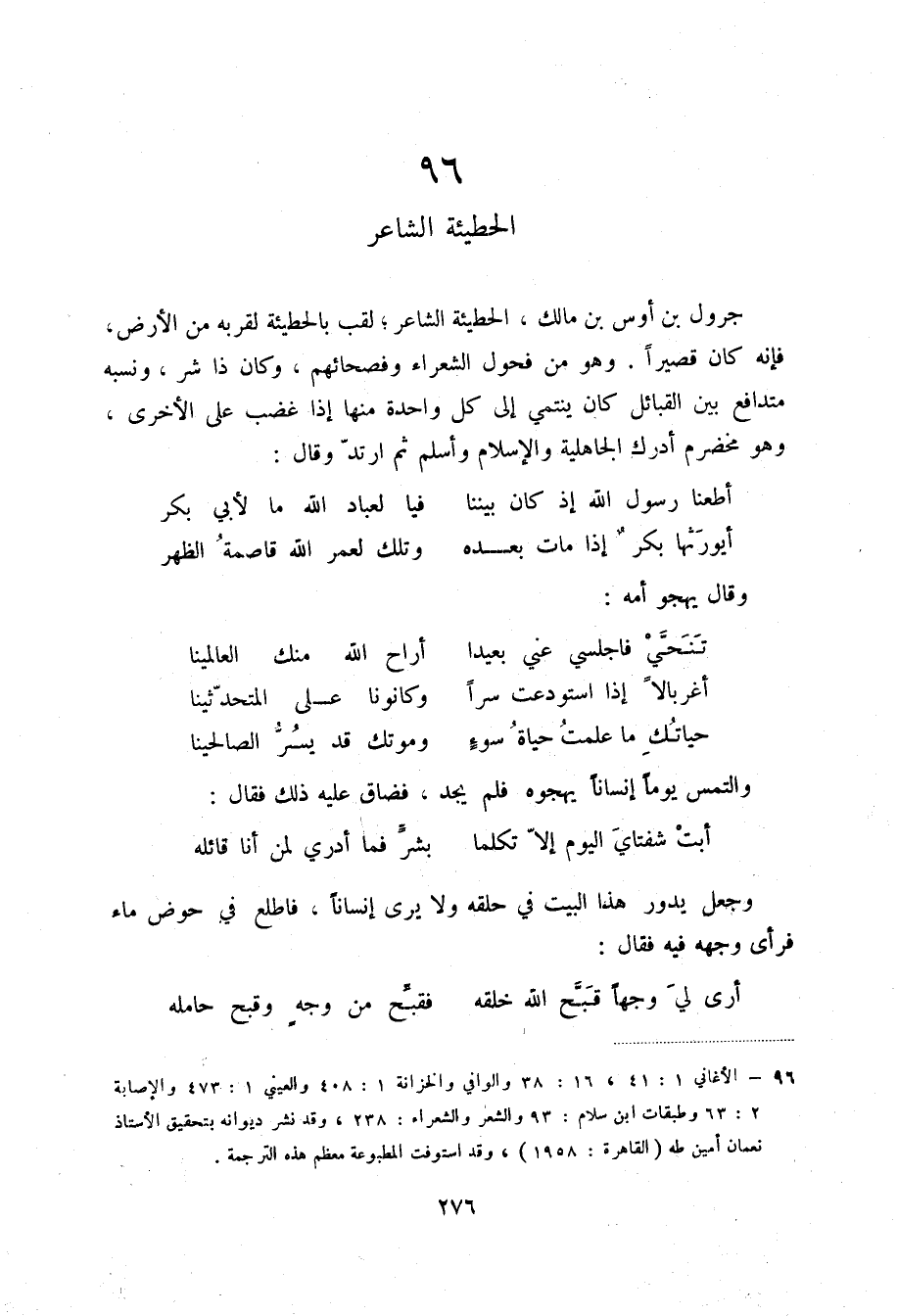 (1) الأغاني 1: 41، 16: 38 والوافي والخزانة 1: 408 والعيني 1: 473 والإصابة 2: 63 وطبقات ابن سلام: 93 والشعر والشعراء: 238، وقد نشر ديوانه بتحقيق الأستاذ نعمان أمين طه (القاهرة: 1058) ، وقد استوفت المطبوعة معظم هذه الترجمة.