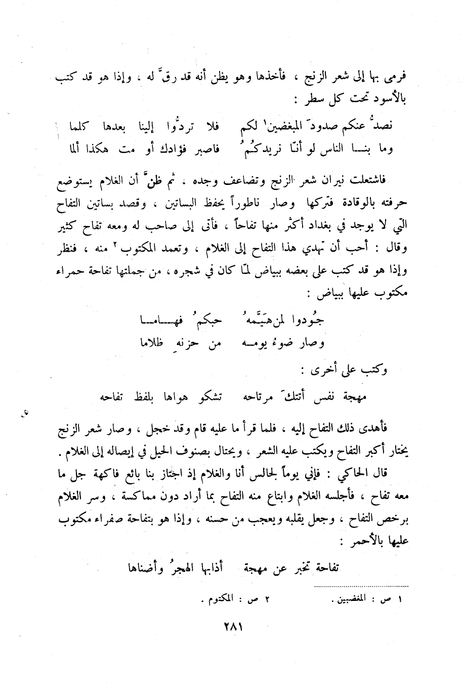وما بنا الناس لو أنّا نريدكم ... فاصبر فؤادك أو مت هكذا ألما فاشتعلت نيران شعر الزنج وتضاعف وجده، ثم ظن أن الغلام يستوضع حرفته بالوقادة فتركها وصار ناطوراً يحفظ البساتين، وقصد بساتين التفاح التي لا يوجد في بغداد أكثر منها تفاحاً، فأتى إلى صاحب له ومعه تفاح كثير وقال: أحب أن تهدي هذا التفاح إلى الغلام، وتعمد المكتوب (2) منه، فنظر وإذا هو قد كتب على بعضه ببياض لما كان في شجره، من جملتها تفاحة حمراء مكتوب عليها ببياض: