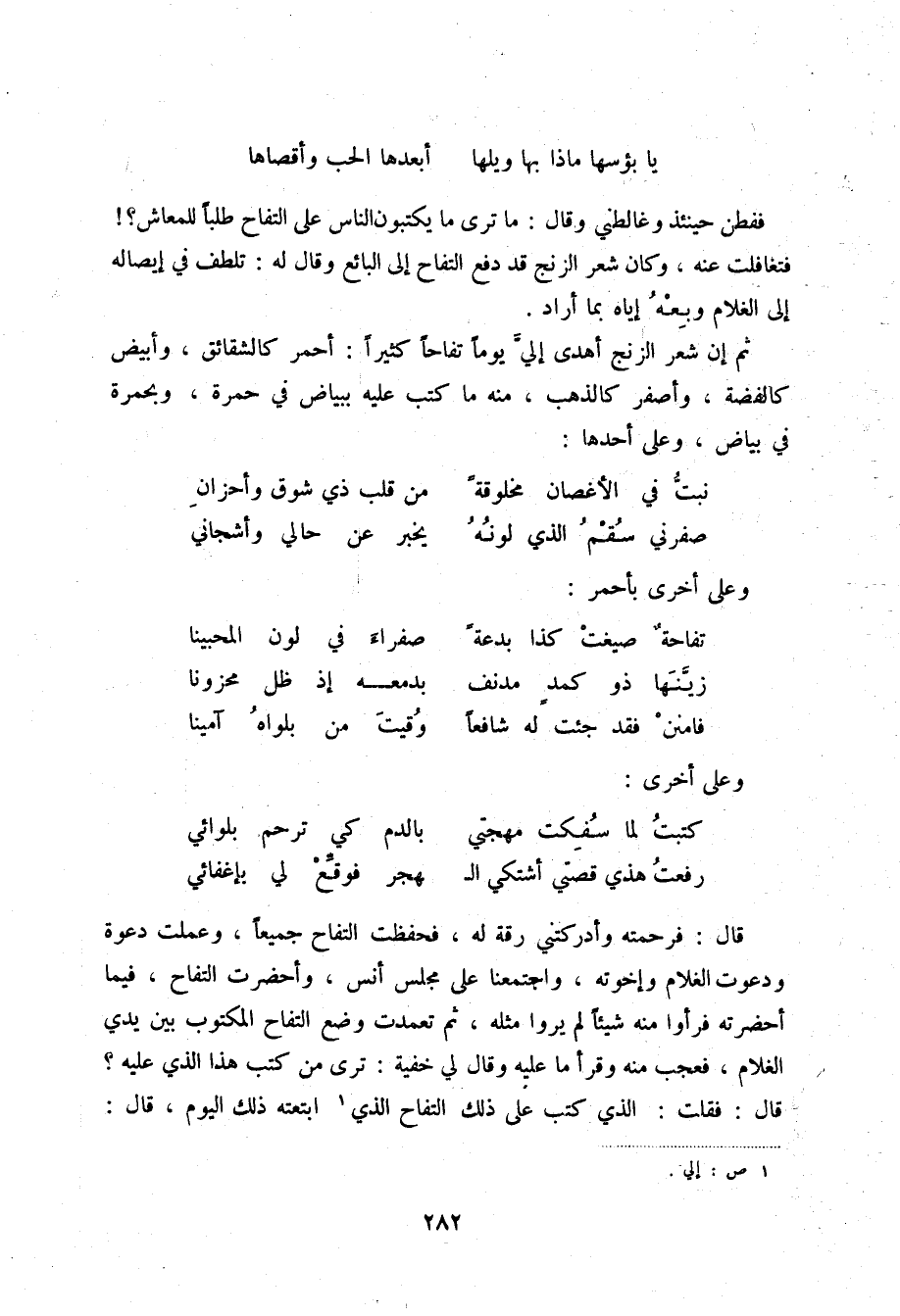 يا بؤسها ماذا بها ويلها ... أبعدها الحب وأقصاها ففطن حينئذ وغالطني وقال: ما ترى ما يكتبون الناس على التفاح طلباً للمعاش؟! فتغافلت عنه، وكان شعر الزنج قد دفع التفاح إلى البائع وقال له: تلطف في إيصاله إلى الغلام وبعه إياه بما أراد.