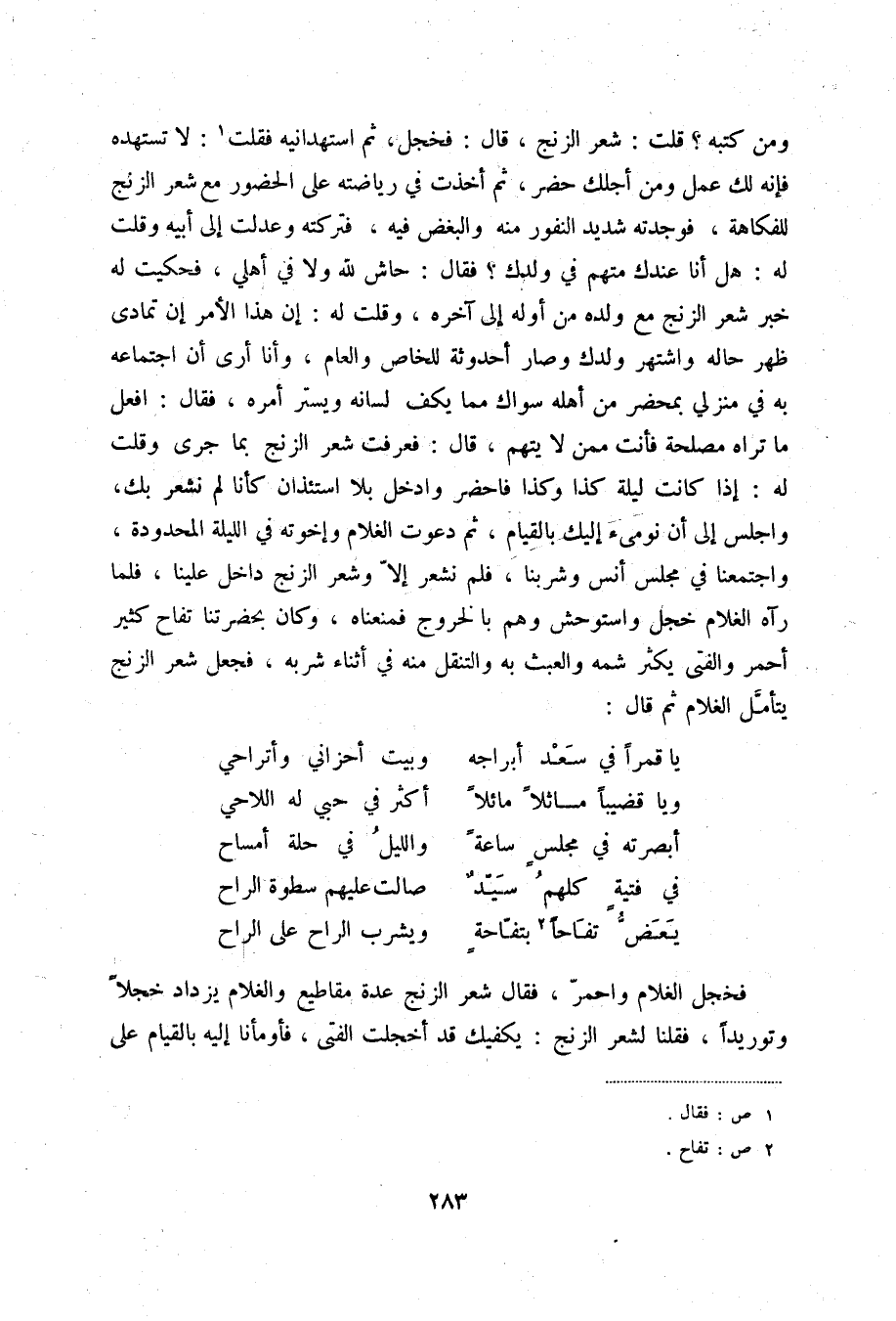يعضّ تفاحاً (2) بتفّاحةٍ ... ويشرب الراح على الراح فخجل الغلام واحمر، فقال شعر الزنج عدة مقاطيع والغلام يزداد خجلاً وتوريداً، فقلنا لشعر الزنج: يكفيك قد أخجلت الفتى، فأومأنا إليه بالقيام على