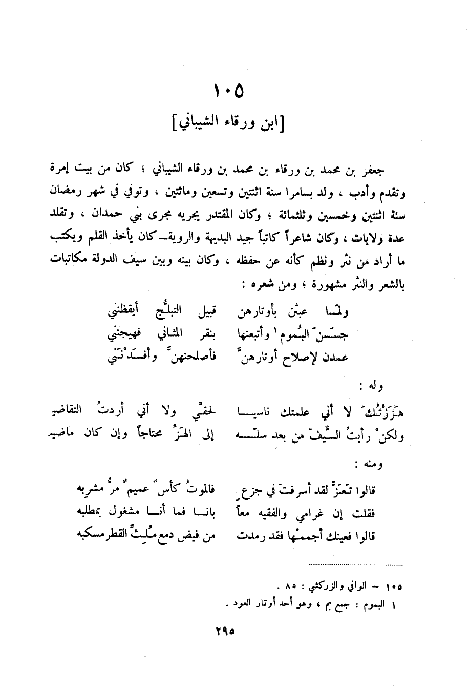 جعفر بن محمد بن ورقاء بن محمد بن ورقاء الشيباني؛ كان من بيت إمرة وتقدم وأدب، ولد بسامرا سنة اثنتين وتسعين ومائتين، وتوفي في شهر رمضان سنة اثنتين وخمسين وثلثمائة؛ وكان المقتدر يجريه مجرى بني حمدان، وتقلد عدة ولايات، وكان شاعراً كاتباً جيد البديهة والروية كان يأخذ القلم ويكتب ما أراد من نثر ونظم كأنه عن حفظه، وكان بينه وبين سيف الدولة مكاتبات بالشعر والنثر مشهورة؛ ومن شعره: