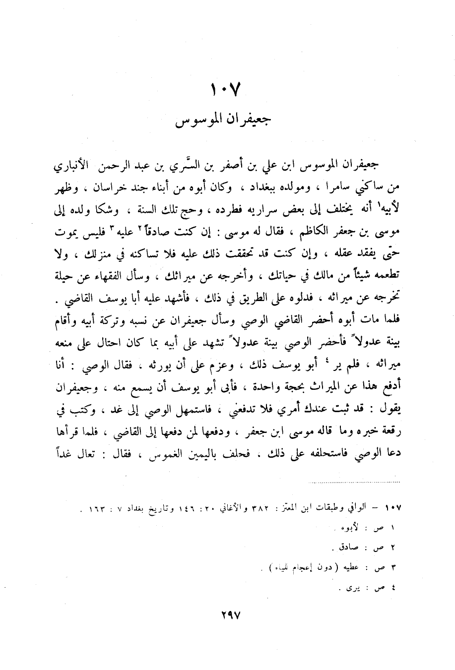 جعيفران الموسوس ابن علي بن أصفر بن السري بن عبد الرحمن الأنباري من ساكني سامرا، ومولده ببغداد، وكان أبوه من أبناء جند خراسان، وظهر لأبيه (2) أنه يختلف إلى بعض سراريه فطرده، وحج تلك السنة، وشكا ولده إلى موسى بن جعفر الكاظم، فقال له موسى: إن كنت صادقاً (3) عليه (4) فليس يموت حتى يفقد عقله، وإن كنت قد تحققت ذلك عليه فلا تساكنه في منزلك، ولا تطعمه شيئاً من مالك في حياتك، وأخرجه عن ميراثك، وسأل الفقهاء عن حيلة تخرجه عن ميراثه، فدلوه على الطريق في ذلك، فأشهد عليه أبا يوسف القاضي. فلما مات أبوه أحضر القاضي الوصي وسأل جعيفران عن نسبه وتركة أبيه وأقام بينة عدولاً فأحضر الوصي بينة عدولاً تشهد على أبيه بما كان احتال على منعه ميراثه، فلم ير (5) أبو يوسف ذلك، وعزم على أن يورثه، فقال الوصي: أنا أدفع هذا عن الميراث بحجة واحدة، فأبى أبو يوسف أن يسمع منه، وجعيفران يقول: قد ثبت عندك أمري فلا تدفعني، فاستمهل الوصي إلى غد، وكتب في رقعة خبره وما قاله موسى ابن جعفر، ودفعها لمن دفعها إلى القاضي، فلما قرأها دعا الوصي فاستحلفه على ذلك، فحلف باليمين الغموس، فقال: تعال غداً