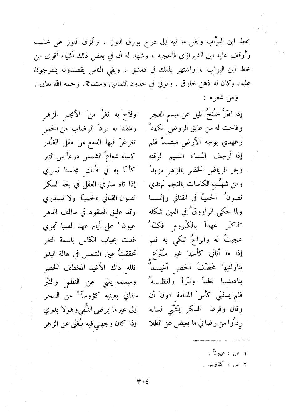 بخط ابن البواب ونقل ما فيه إلى درج بورق التوز وألزق التوز على خشب وأوقف عليه ابن الشيرازي فأعجبه، وشهد له أن في بعض ذلك أشياء أقوى من خط ابن البواب، واشتهر بذلك في دمشق، وبقي الناس يقصدونه يتفرجون عليه، وكان له ذهن خارق، وتوفي في حدود الثمانين وستمائة، رحمه الله تعالى.