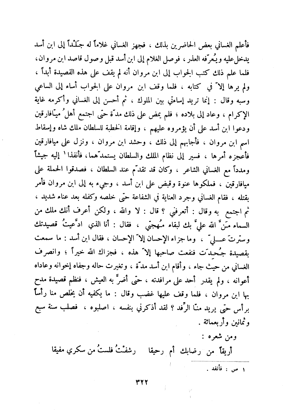 فأعلم الغساني بعض الحاضرين بذلك، فجهز الغساني غلاماً له جلداً إلى ابن أسد يدخل عليه ويعرفه العذر، فوصل الغلام إلى ابن أسد قبل وصول قاصد ابن مروان، فلما علم ذلك كتب الجواب إلى ابن مروان أنه لم يقف على هذه القصيدة أبداً، ولم يرها إلا في كتابه، فلما وقف ابن مروان على الجواب أساء إلى الساعي وسبه وقال: إنما تريد إساءتي بين الملوك، ثم أحسن إلى الغساني وأكرمه غاية الإكرام، وعاد إلى بلاده؛ فلم يمض على ذلك مدة حتى اجتمع أهل ميافارقين ودعوا ابن أسد على أن يؤمروه عليهم، وإقامة الخطبة للسلطان ملك شاه وإسقاط اسم ابن مروان، فأجابهم إلى ذلك، وحشد ابن مروان، ونزل على ميافارقين فأعجزه أمرها، فسير إلى نظام الملك والسلطان يستمدهما، فأنفذا (1) إليه جيشاً ومدداً مع الغساني الشاعر، وكان قد تقدم عند السلطان، فصدقوا الحملة على ميافارقين، فملكوها عنوة وقبض على ابن أسد، وجيء به إلى ابن مروان فأمر بقتله، فقام الغساني وجرد العناية في الشفاعة حتى خلصه وكفله بعد عناء شديد، ثم اجتمع به وقال: أتعرفني؟ قال: لا والله، ولكن أعرف أنك ملك من السماء من الله علي بك لبقاء مهجتي، فقال: أنا الذي ادعيت قصيدتك وسترت علي، وما جزاء الإحسان إلا الإحسان، فقال ابن أسد: ما سمعت بقصيدة جحدت فنفعت صاحبها إلا هذه، فجزاك الله خيراً؛ وانصرف الغساني من حيث جاء، وأقام ابن أسد مدة، وتغيرت حالة وجفاه إخوانه وعاداه أعوانه، ولم يقدر أحد على مرافدته، حتى أضر به العيش، فنظم قصيدة مدح بها ابن مروان، فلما وقف عيها غضب وقال: ما يكفيه أن يخلص منا رأساً برأس حتى يريد منا الرفد؟ لقد أذكرني بنفسه، اصلبوه، فصلب سنة سبع وثمانين وأربعمائة.