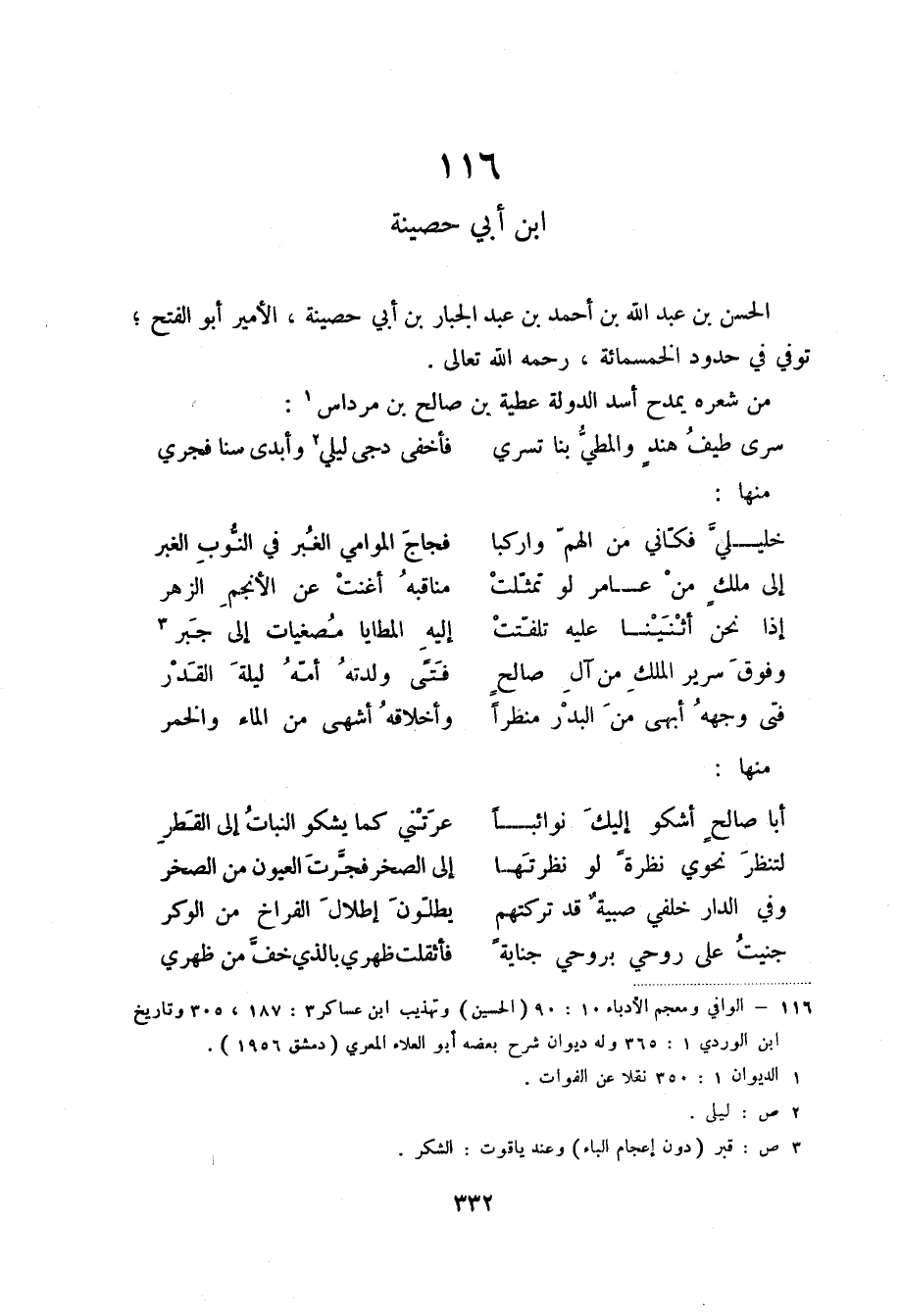 (1) الوافي ومعجم الأدباء 10: 90 (الحسين) وتهذيب ابن عساكر 3: 187، 305 وتاريخ ابن الوردي 1: 365 وله ديوان شرح بعضه أبو العلاء المعري (دمشق 1956) .