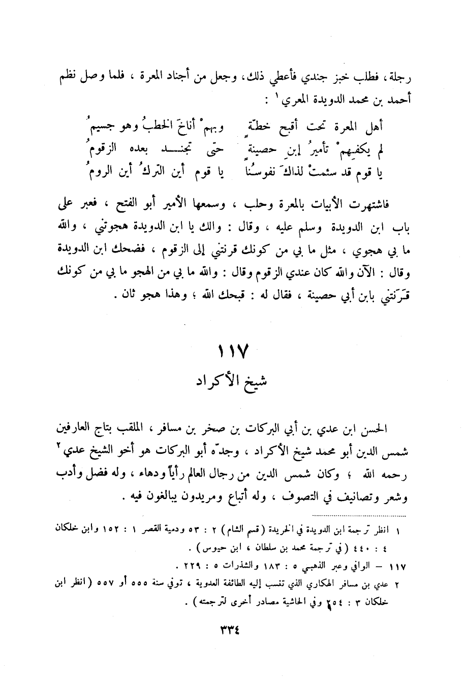(3) عدي بن سافر الهكاري الذي تنسب إليه الطائفة العدوية، توفي سنة 555 أو 557 (انظر ابن خلكان 3: 254 وفي الحاشية مصادر أخرى لترجمته) .