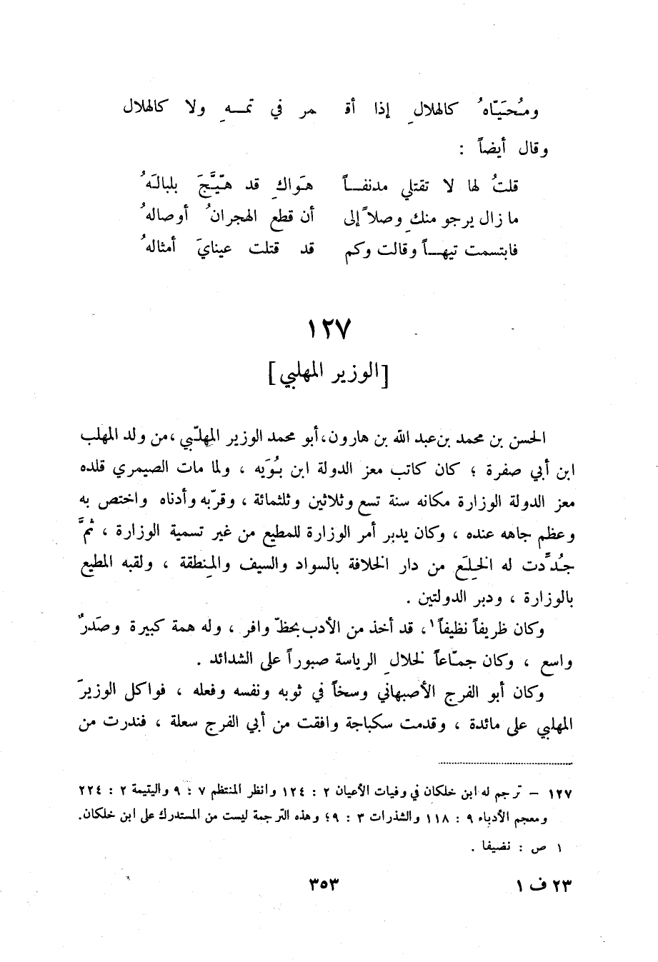 (1) ترجم له ابن خلكان في وفيات الأعيان 2: 124 وانظر المنتظم 7: 9 واليتيمة 2: 224 ومعجم الأدباء 9: 118 والشذرات 3: 9؛ وهذه الترجمة ليست من المستدرك على ابن خلكان.