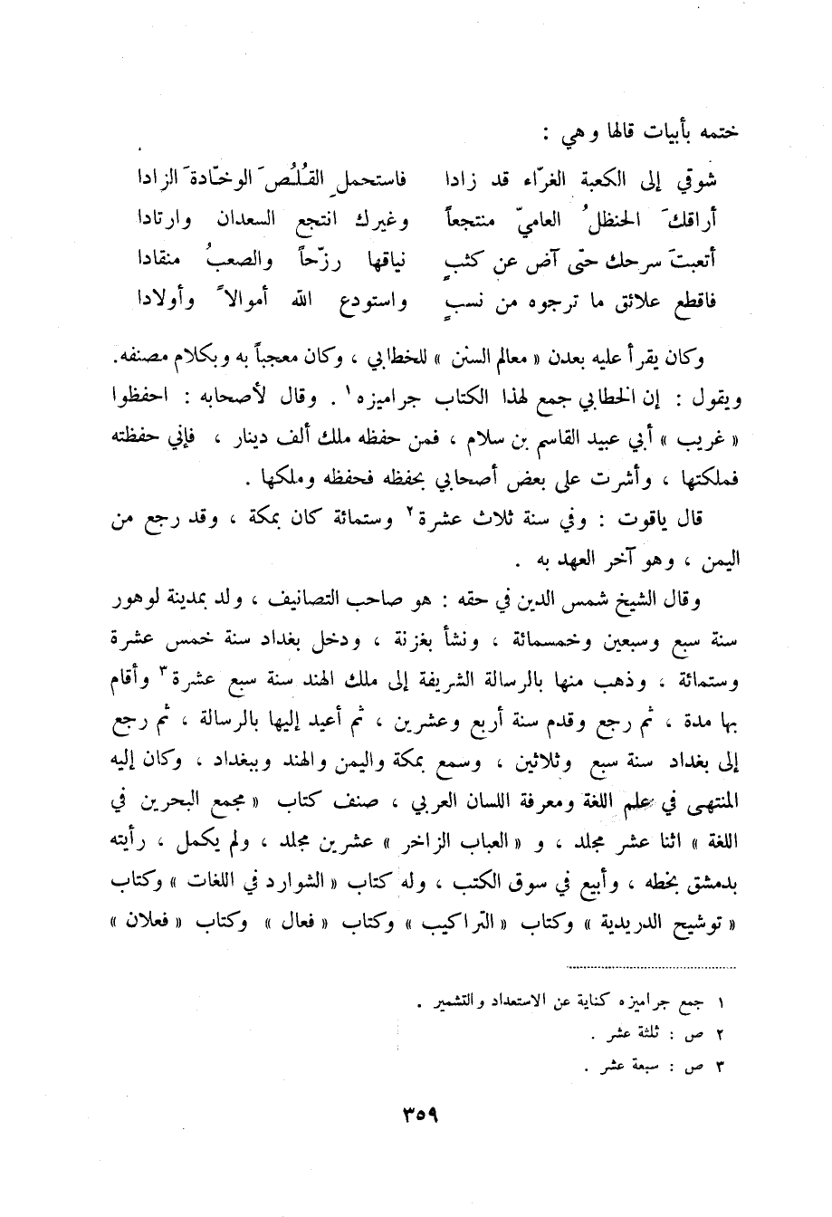فاقطع علائق ما ترجوه من نسبٍ ... واستودع الله أموالاً وأولادا وكان يقرأ عليه بعدن معالم السنن للخطابي، وكان معجباً به وبكلام مصنفه. ويقول: إن الخطابي جمع لهذا الكتاب جراميزه (1) . وقال لأصحابه: احفظوا غريب أبي عبيد القاسم بن سلام، فمن حفظه ملك ألف دينار، فإني حفظته فملكتها، وأشرت على بعض أصحابي بحفظه فحفظه وملكها.