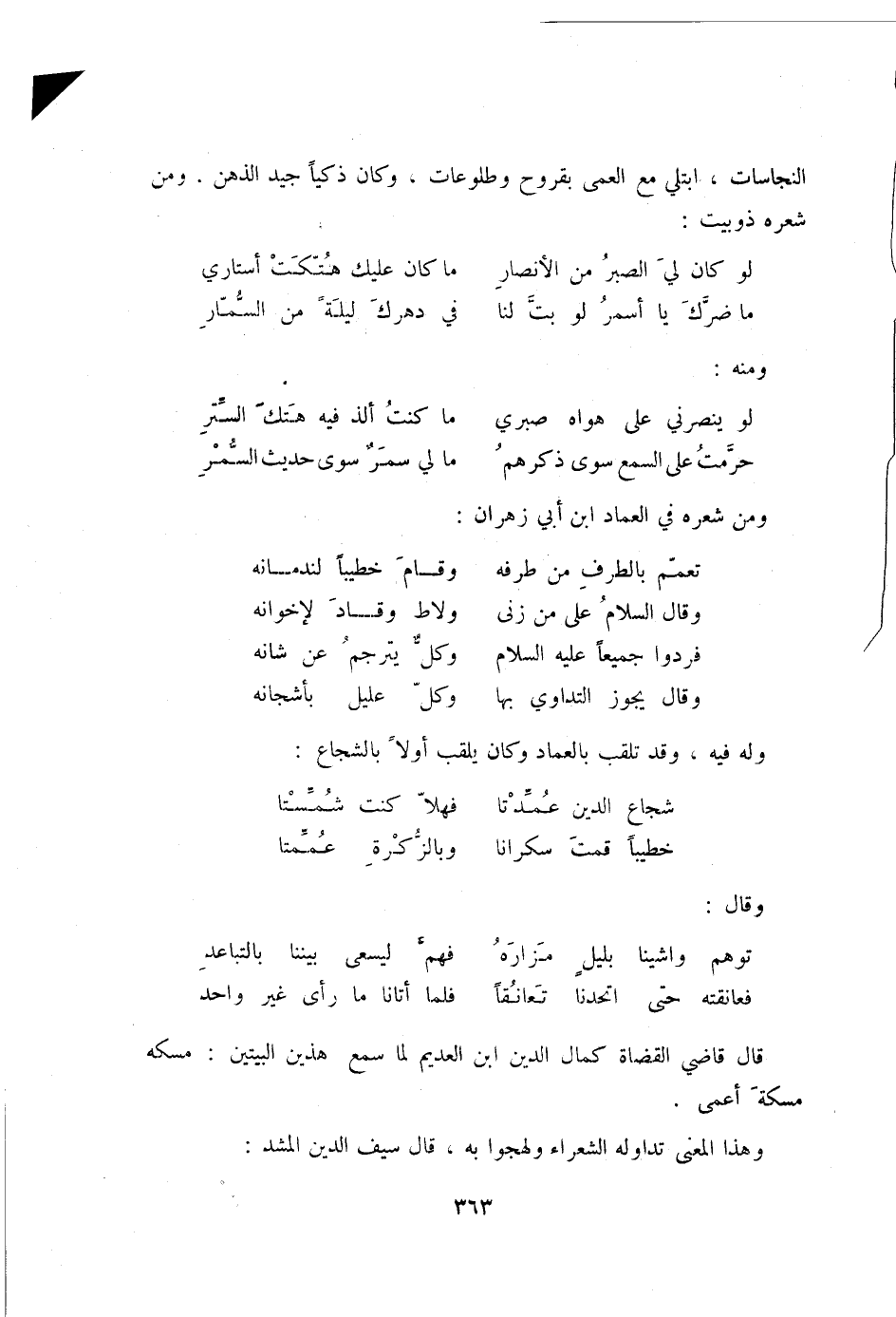 فعانقته حتى اتحدنا تعانقاً ... فلما أتانا ما رأى غير واحد قال قاضي القضاة كمال الدين ابن العديم لما سمع هذين البيتين: مسكه مسكة أعمى.