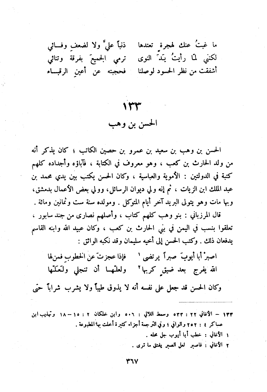 (1) الأغاني 22: 523 وسيط اللآلي: 506 وابن خلكان 2: 15 - 18 وتهذيب ابن عساكر 4: 252؛ والترجمة أجزاء كثيرة أخلت بها المطبوعة.